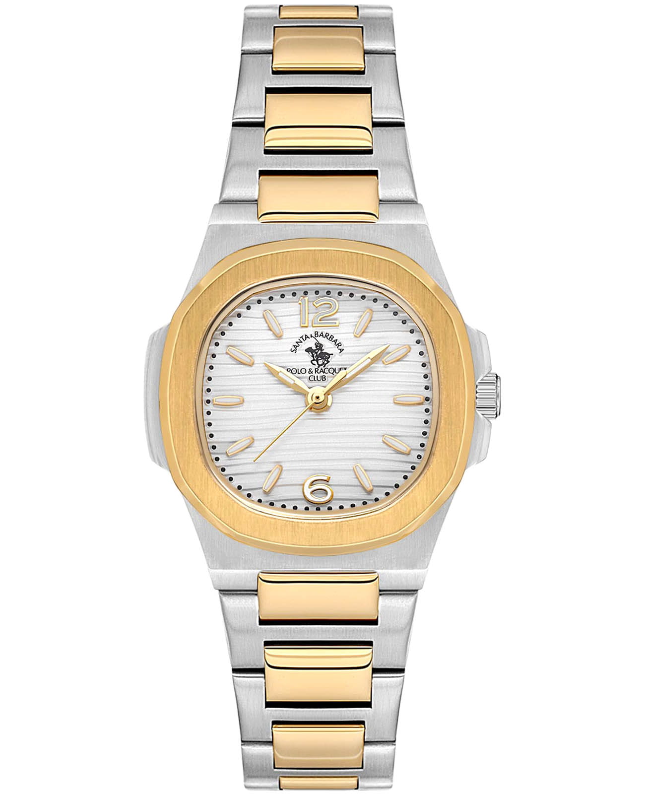 Женские кварцевые Santa Barbara Polo & Racquet Club SB.1.10590-5 — воплощение элегантности и технического совершенства. Изысканный корпус из нержавеющей стали, диаметром 26,2 мм, что делает их устойчивыми к внешним воздействиям и придает благородный вид. Стрелки и метки с люминесцентным покрытиемЛюминесцентное покрытиеПозволяет считывать показания времени в темноте. Производители наносят на стрелки, часовые индексы, безель или поверхность циферблата светонакопительный состав, дающий холодное свечение., обеспечивающим хорошую читаемость в темноте. Изящный циферблат защищён минеральным стекломМинеральное стеклоМинеральное стекло представляет собой искусственно выращенный минерал кварца. Такое стекло отличается особой устойчивостью к повреждениям и царапинам. Уступает по некоторым качествам сапфировому стеклу., устойчивое к царапинам и механическим повреждениям. Браслет из стали с частичным IP-покрытиемIP-покрытиеМетод ионного напыления. Демонстрирует повышенную устойчивость к истиранию, окислению и химическим веществам. Под воздействием высокого давления и температуры около 1500°C молекулы металла надёжно соединяются с частицами корпуса часов. на раскладной застёжкеРаскладная застёжкаТакой тип застёжки используется только на браслетах из металла. Она никогда не раскрывается полностью, происходит разделение на 2 и более частей. Раскладывающая застёжка снизит вероятность потери часов к минимуму. обеспечивает комфортное и безопасное ношение. Декоративный безельБезельВнешний ободок, закрепляющий стекло. В спортивных часах так называется поворотное кольцо с делениями на циферблате, выполняет роль таймера – замеряет отрезки времени на шкале. Неподвижный безель – элемент декора. Однонаправленно вращающийся безель на дайверских часах позволяет фиксировать моменты погружения и выныривания на поверхность. с IP-покрытиемIP-покрытиеМетод ионного напыления. Демонстрирует повышенную устойчивость к истиранию, окислению и химическим веществам. Под воздействием высокого давления и температуры около 1500°C молекулы металла надёжно соединяются с частицами корпуса часов. золотистого цвета. Водонепроницаемость 50 метров позволит защитить корпус от случайных брызг или капель дождя. Идеальный выбор для тех, кто ценит элегантный дизайн и качество.