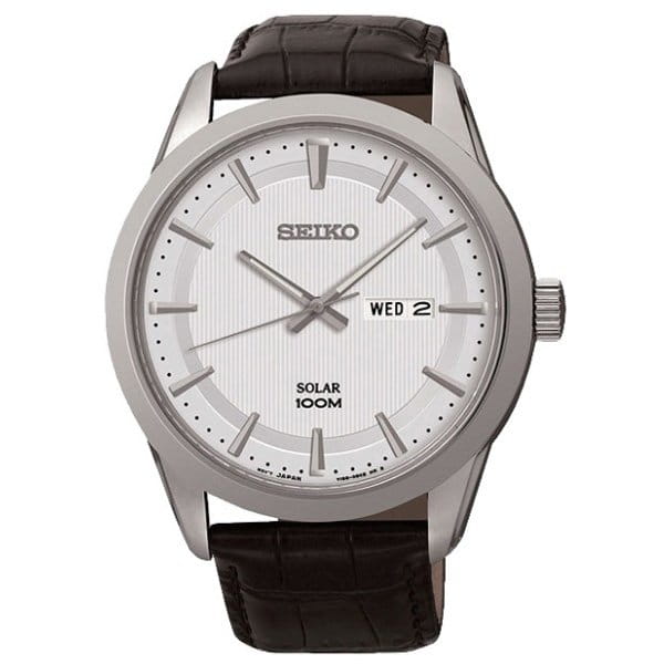 Успешные люди, желающие идти в ногу со временем, выбирают инновационные и надежные часы марки Seiko. Механизм Seiko V158 работает от солнечной энергии. Корпус круглой формы часов выполнен из высокопрочной стали. Белый фон циферблата и стальные элементы дизайна. Часы снабжены минеральным стеклом Hardlex, устойчивым к царапинам. Водонепроницаемость 10 ATM. Часы прочно удерживаются на руке ремешком из натуральной кожи.