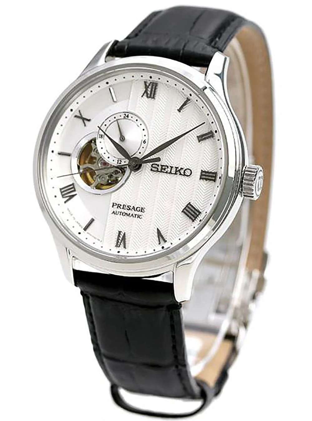 Мужские механические часы с автоподзаводом Seiko SARY095 — элегантное сочетание японской инженерии и классического дизайна. Круглый корпус размером 41 мм из нержавеющей стали, белый циферблат с римскими цифрами и частично скелетонизированным циферблатом, а также 24-часовой стрелкой. Стекло — сапфировоеСапфировое стеклоПрочный и надёжный материал из кристалла сапфира синтетического происхождения, характеризующийся особой твёрдостью и устойчивостью к царапинам и повреждениям.. Механизм японский калибр 4R39 (24 камня, запас хода 41 час), с функцией stop-second и возможностью ручного завода. Водонепроницаемость 30 м. Ремешок чёрный кожаный на раскладной застёжкеРаскладная застёжкаТакой тип застёжки используется только на браслетах из металла. Она никогда не раскрывается полностью, происходит разделение на 2 и более частей. Раскладывающая застёжка снизит вероятность потери часов к минимуму.. Задняя крышка — прозрачная и завинчивающаяся. Идеальный выбор для тех, кто ценит японское качество и классический стиль.