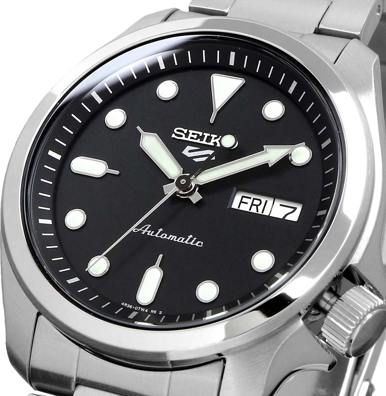 Мужские механические японские наручные часы Seiko 5 Sports SRPE55K1, механический механизм (автоматический калибр) с высокой точностью. Класс водозащиты: 100 метров, позволит плавать, нырять и заниматься другими водными видами спорта. Корпус часов изготовлен из стали. Окошки дня недели и даты находятся в положении 3 часа. Стрелки и метки с люминесцентным покрытиемЛюминесцентное покрытиеПозволяет считывать показания времени в темноте. Производители наносят на стрелки, часовые индексы, безель или поверхность циферблата светонакопительный состав, дающий холодное свечение.. Стальной браслет на раскладной застёжкеРаскладная застёжкаТакой тип застёжки используется только на браслетах из металла. Она никогда не раскрывается полностью, происходит разделение на 2 и более частей. Раскладывающая застёжка снизит вероятность потери часов к минимуму..