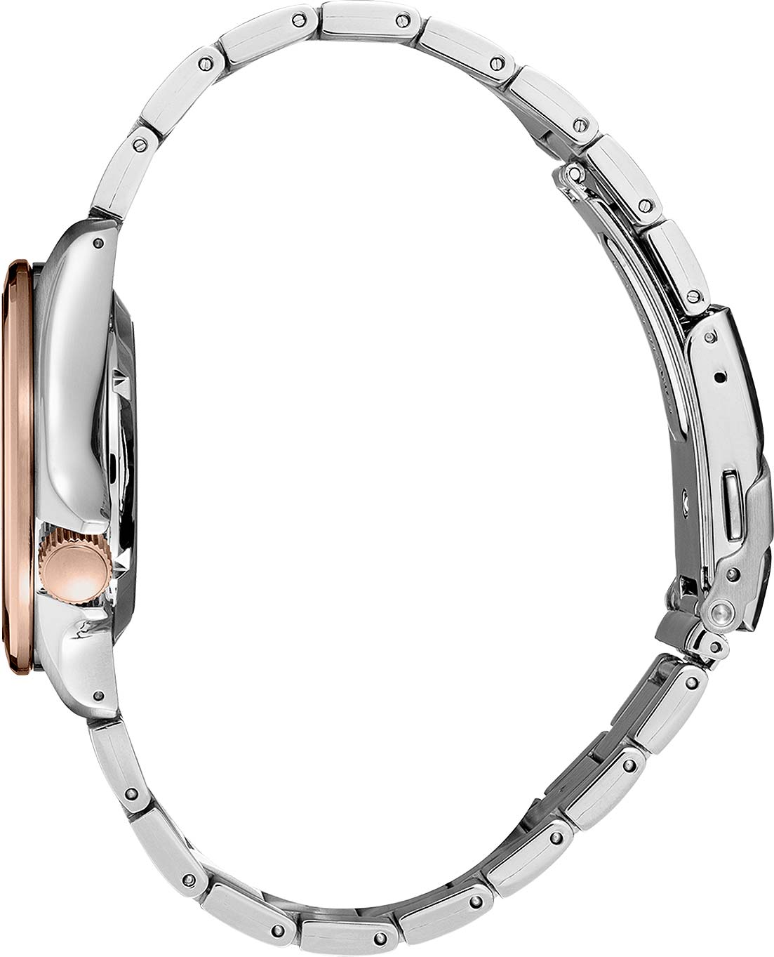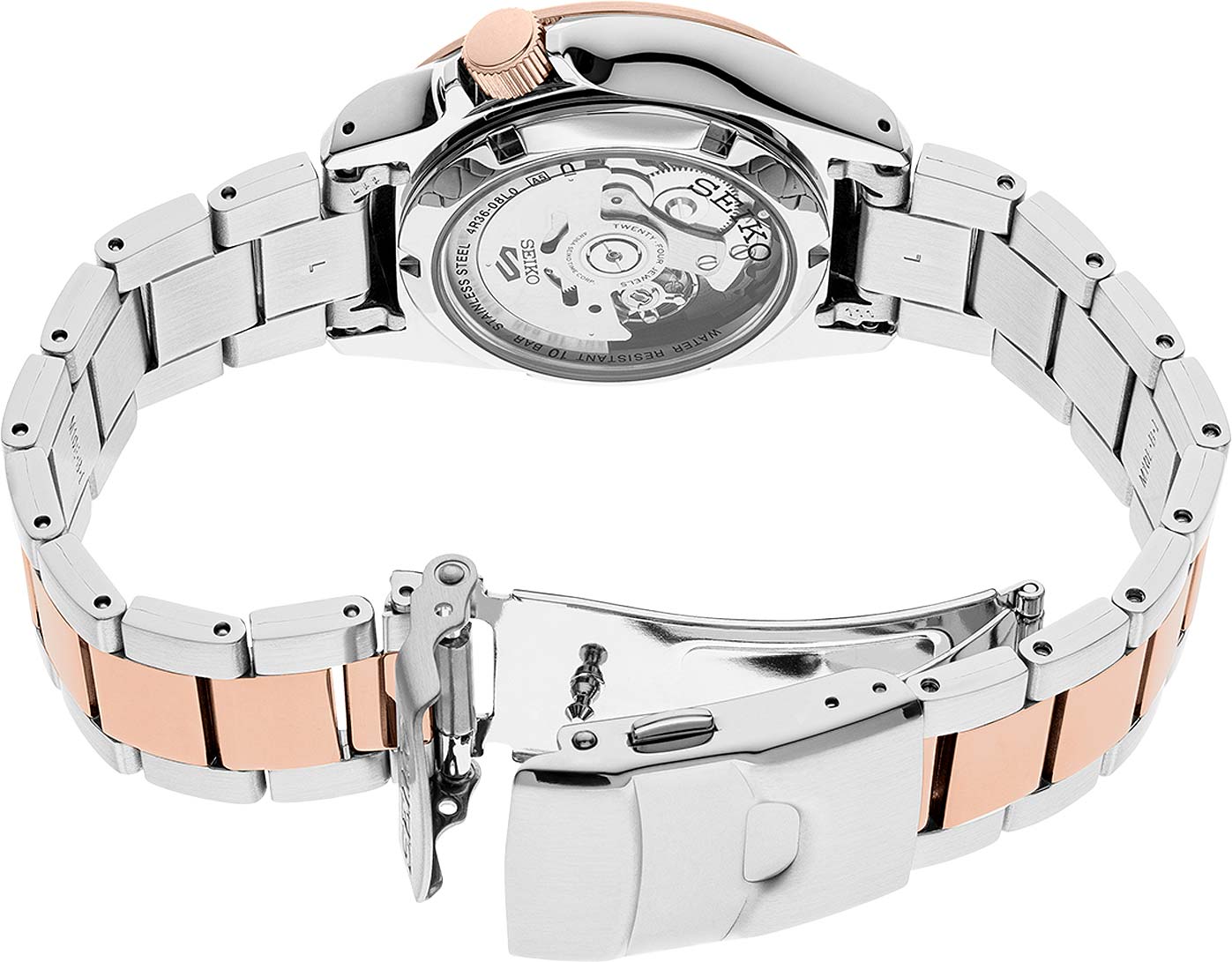 Водозащита 100 метров (10 бар) позволяет использовать часы для плавания и других водных видов спорта. Стальной браслет с частичным PVD-покрытиемPVDУльтратонкое покрытие наносится в технике вакуумного напыления, сочетает в себе нитрид титана особой прочности со слоем золота или оксида хрома. Несёт в себе декоративную или защитную функцию. розового золота и раскладной застёжкойРаскладная застёжкаТакой тип застёжки используется только на браслетах из металла. Она никогда не раскрывается полностью, происходит разделение на 2 и более частей. Раскладывающая застёжка снизит вероятность потери часов к минимуму. обеспечивает комфортное ношение и надёжную фиксацию на запястье.