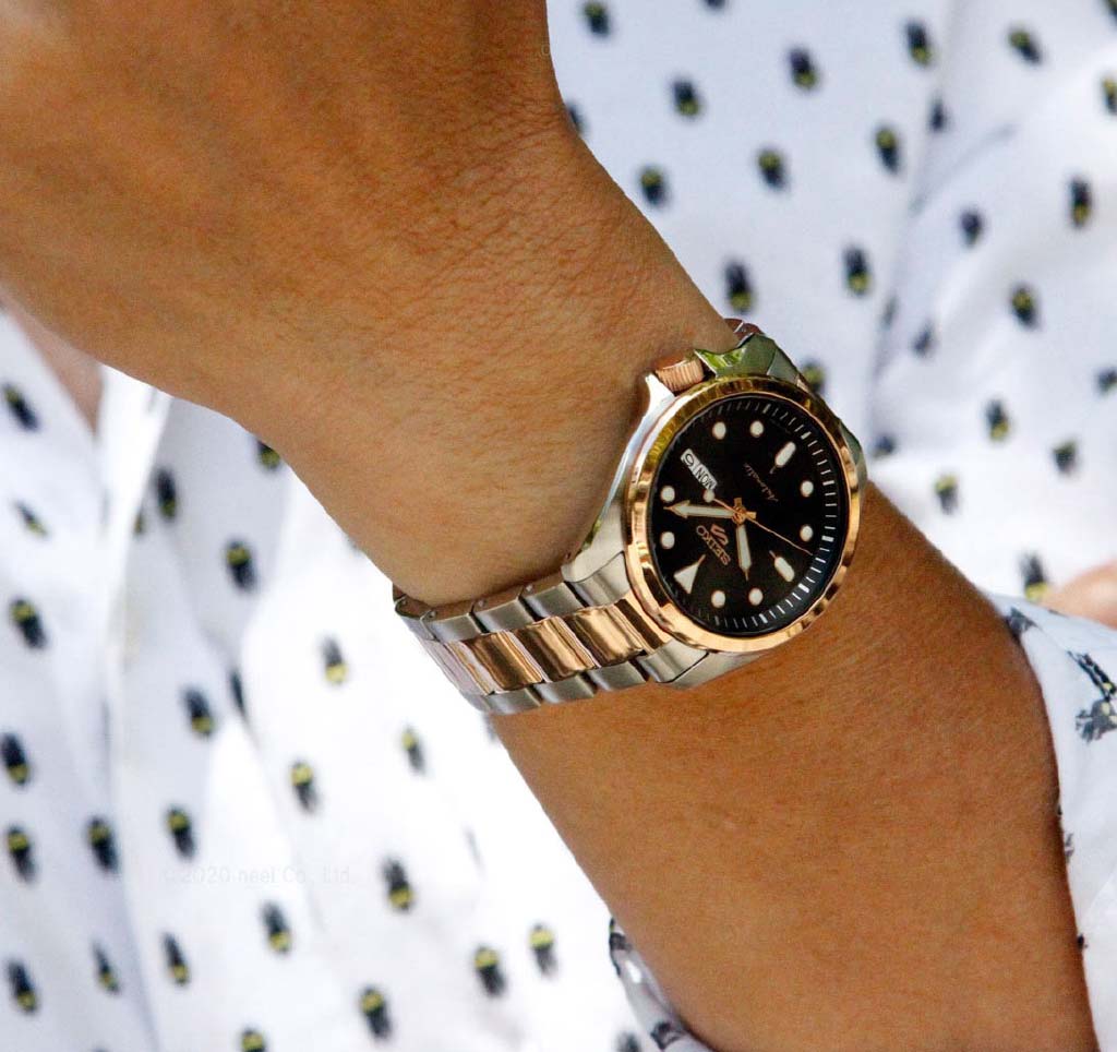 Часы Seiko 5 Sports SRPE58K1 сочетают в себе элегантный дизайн и надёжность, характерные для японского часового мастерства. Корпус диаметром 40 мм выполнен из нержавеющей стали с частичным PVD-покрытиемPVDУльтратонкое покрытие наносится в технике вакуумного напыления, сочетает в себе нитрид титана особой прочности со слоем золота или оксида хрома. Несёт в себе декоративную или защитную функцию. розового золота, придающим часам утончённый вид. Чёрный циферблат защищён минеральным стекломМинеральное стеклоМинеральное стекло представляет собой искусственно выращенный минерал кварца. Такое стекло отличается особой устойчивостью к повреждениям и царапинам. Уступает по некоторым качествам сапфировому стеклу. с повышенной прочностью.