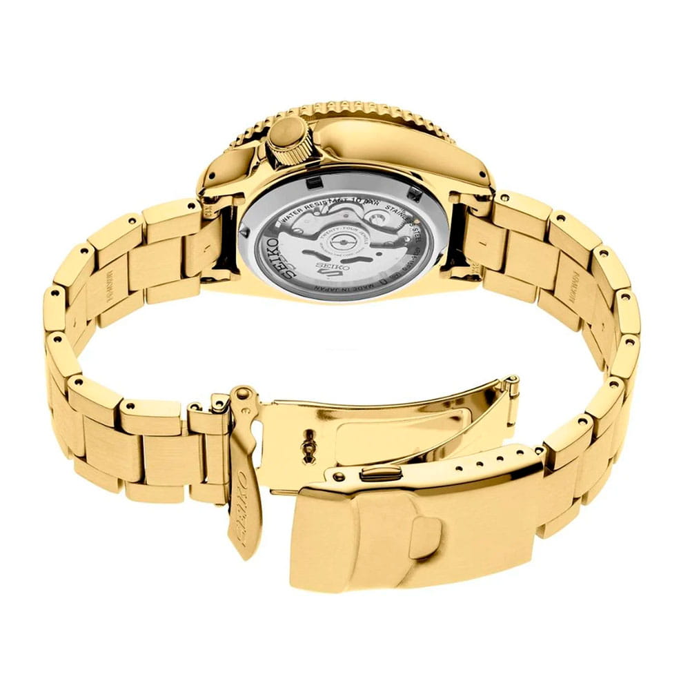 Часы Seiko 5 Sports SRPK18 представляют собой элегантное сочетание классического дизайна и современных технологий. Корпус диаметром 42,5 мм выполнен из нержавеющей стали с PVD-покрытиемPVDУльтратонкое покрытие наносится в технике вакуумного напыления, сочетает в себе нитрид титана особой прочности со слоем золота или оксида хрома. Несёт в себе декоративную или защитную функцию. золотого цвета, придающим часам утончённый вид. Чёрный циферблат защищён минеральным стекломМинеральное стеклоМинеральное стекло представляет собой искусственно выращенный минерал кварца. Такое стекло отличается особой устойчивостью к повреждениям и царапинам. Уступает по некоторым качествам сапфировому стеклу. с повышенной прочностью.