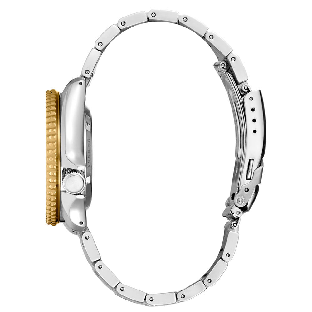 Водозащита 100 метров (10 бар) позволяет использовать часы для плавания и других водных видов спорта. Стальной браслет с двухцветным PVD-покрытиемPVDУльтратонкое покрытие наносится в технике вакуумного напыления, сочетает в себе нитрид титана особой прочности со слоем золота или оксида хрома. Несёт в себе декоративную или защитную функцию. и раскладной застёжкойРаскладная застёжкаТакой тип застёжки используется только на браслетах из металла. Она никогда не раскрывается полностью, происходит разделение на 2 и более частей. Раскладывающая застёжка снизит вероятность потери часов к минимуму. обеспечивает комфортное ношение и надёжную фиксацию на запястье. ​​