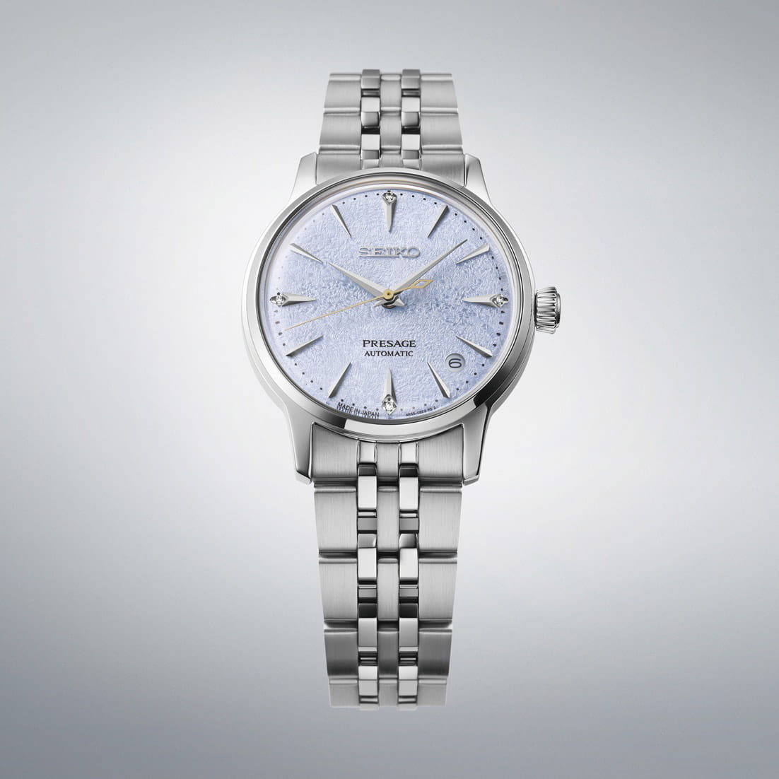 Модель Seiko Presage Cocktail Donna SRPL61 вдохновлена свежестью японского коктейля Frozen Sky Diving. Часы отличаются циферблатом с четырьмя метками из драгоценных камней, что придаёт им особую роскошь и изысканность. Корпус диаметром 34 мм изготовлен из нержавеющей стали, а стекло выполнено по технологии Hardlex — это минеральное стеклоМинеральное стеклоМинеральное стекло представляет собой искусственно выращенный минерал кварца. Такое стекло отличается особой устойчивостью к повреждениям и царапинам. Уступает по некоторым качествам сапфировому стеклу. повышенной прочности, устойчивое к мелким механическим повреждениям. Механизм — автоматический калибр 4R35, обеспечивающий надёжную работу часов и запас хода до 41 часа. Функция отображения даты добавляет модели практичности. Часы водонепроницаемы до 5 атмосфер, что соответствует защите от случайных капель дождя. Браслет и застёжка выполнены из стали, оснащены раскладной застёжкойРаскладная застёжкаТакой тип застёжки используется только на браслетах из металла. Она никогда не раскрывается полностью, происходит разделение на 2 и более частей. Раскладывающая застёжка снизит вероятность потери часов к минимуму., обеспечивающей удобство ношения. Дизайн часов дополнен классическим сочетанием материалов и цветов, что делает их универсальным аксессуаром для повседневного и торжественного образа. Модель 2025 года имеет современный, лаконичный внешний вид, сохраняя при этом традиционные элементы часового мастерства Seiko.