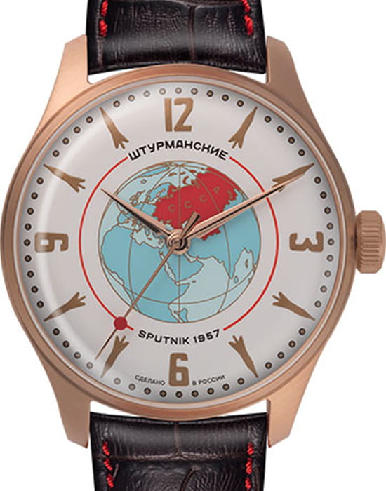 Модель посвящена запуску первого искусственного спутника Земли 4 октября 1957 года. Штурманские увековечили это революционное событие в специальной коллекции. Российские наручные часы Штурманские Спутник 2609-3739432 выводят понятия красоты, надежности и функциональности на новый, ранее недостижимый уровень. В центре циферблата расположено изображение планеты из космоса, роль секундной стрелки выполняет вращающийся диск с изображением спутника. Тем самым каждую минуту спутник делает «оборот» вокруг Земли.