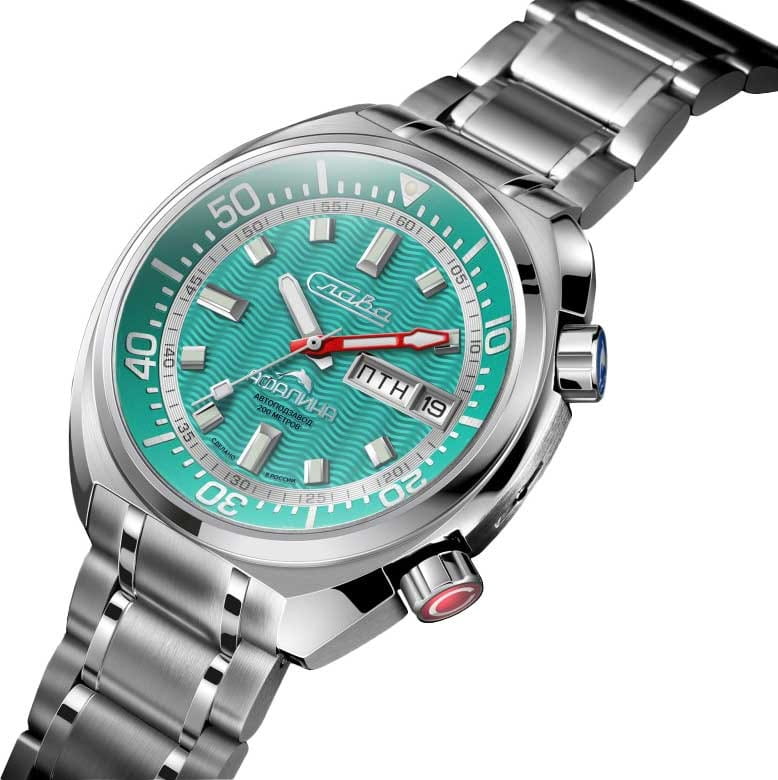Коллекционные часы Слава Афалина 2430583/100-2427 — это превосходный выбор для тех, кто ценит стиль и функциональность. Модель из лимитированной серии, состоящей всего из 500 экземпляров, отличается прочным стальным корпусом и предназначена для любителей дайвинга. Часы оснащены надежным механическим механизмом с автоподзаводом и водозащитой до 200 метров, что делает их идеальными для подводных приключений. Бирюзовый циферблат дополняется стрелками с люминесцентным покрытиемЛюминесцентное покрытиеПозволяет считывать показания времени в темноте. Производители наносят на стрелки, часовые индексы, безель или поверхность циферблата светонакопительный состав, дающий холодное свечение. для отличной видимости в условиях низкой освещенности, а сапфировое стеклоСапфировое стеклоПрочный и надёжный материал из кристалла сапфира синтетического происхождения, характеризующийся особой твёрдостью и устойчивостью к царапинам и повреждениям. с антибликовым покрытиемАнтибликовое покрытиеСлой оксида металла в 0,13-0,3 микрон, благодаря которому стекло часов не бликует и не отражает свет. Антибликовое покрытие уменьшает отражение света в 10 раз, обеспечивая отличную читаемость показателей циферблата. защищает от царапин и бликов. Основная заводная головка расположена на корпусе ближе к отметке ''4 часа'', она позволяет настраивать время и заводить часы перед погружением. С помощью второй головки, расположенной у отметки ''2 часа'', можно управлять вращающимся внутренним кольцом безеляБезельВнешний ободок, закрепляющий стекло. В спортивных часах так называется поворотное кольцо с делениями на циферблате, выполняет роль таймера – замеряет отрезки времени на шкале. Неподвижный безель – элемент декора. Однонаправленно вращающийся безель на дайверских часах позволяет фиксировать моменты погружения и выныривания на поверхность. с PVDPVDУльтратонкое покрытие наносится в технике вакуумного напыления, сочетает в себе нитрид титана особой прочности со слоем золота или оксида хрома. Несёт в себе декоративную или защитную функцию. покрытием бирюзового цвета и фиксировать его в нужном положении. Окошко даты и дня недели удобно расположено на отметке "3 часа", а профессиональная "дайвинг-застежка" стального браслета имеет удлинение для гидрокостюма. Особая забота о природе: часть средств от продажи данной модели перечисляется в центр спасения дельфинов "Дельфа". Часы серии "Афалина" — это не только функциональный аксессуар, но и символ вашей поддержки благородного дела.