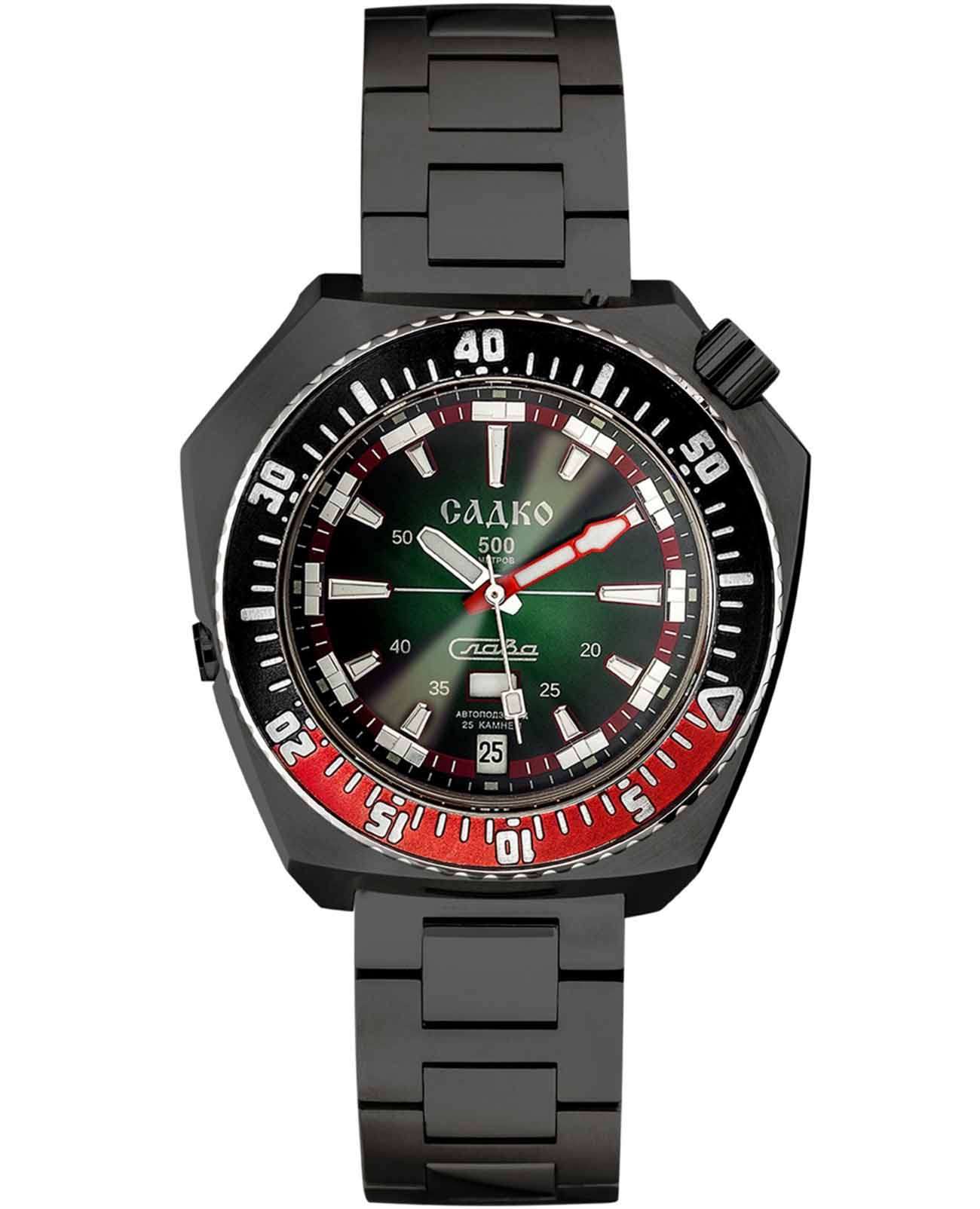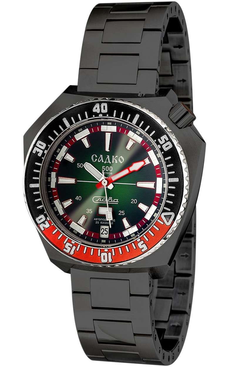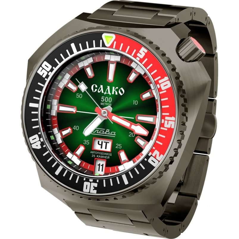 Стильные часы Слава Садко 5006169/100-2427 — станут надежным спутником как в повседневной жизни, так и при покорении морских глубин. Эти часы, созданные в России, оснащены механическим механизмом Слава 2427 с автоподзаводом, который обеспечивает точность и надежность. Корпус выполнен из высококачественной стали 316L с IP-покрытиемIP-покрытиеМетод ионного напыления. Демонстрирует повышенную устойчивость к истиранию, окислению и химическим веществам. Под воздействием высокого давления и температуры около 1500°C молекулы металла надёжно соединяются с частицами корпуса часов. черного цвета. Поворотный безельБезельВнешний ободок, закрепляющий стекло. В спортивных часах так называется поворотное кольцо с делениями на циферблате, выполняет роль таймера – замеряет отрезки времени на шкале. Неподвижный безель – элемент декора. Однонаправленно вращающийся безель на дайверских часах позволяет фиксировать моменты погружения и выныривания на поверхность. часов с IP-покрытиемIP-покрытиеМетод ионного напыления. Демонстрирует повышенную устойчивость к истиранию, окислению и химическим веществам. Под воздействием высокого давления и температуры около 1500°C молекулы металла надёжно соединяются с частицами корпуса часов. красного и черного цвета придаёт модели особую элегантность и долговечность. Яркий зеленый циферблат с метками в виде штрихов надежно защищён сапфировым стекломСапфировое стеклоПрочный и надёжный материал из кристалла сапфира синтетического происхождения, характеризующийся особой твёрдостью и устойчивостью к царапинам и повреждениям., толщина которого составляет 3 мм. Заводная головка с защитой, расположенная в положении 2 часа, и литой стальной браслет с IP-покрытиемIP-покрытиеМетод ионного напыления. Демонстрирует повышенную устойчивость к истиранию, окислению и химическим веществам. Под воздействием высокого давления и температуры около 1500°C молекулы металла надёжно соединяются с частицами корпуса часов. черного цвета и застежкой «бабочка»Застёжка "бабочка"Такой вид застёжки дополняется предохранителями, помогающими избежать случайного раскрытия браслета. Обладают изящным исполнением. обеспечивают комфорт и удобство в использовании. Эти часы имеют водозащиту 500WR, позволяя погружаться на глубину до 50 атмосфер, что делает их идеальными для дайвинга. Автоматический гелиевый клапан добавляет дополнительную надежность при подводных приключениях. Функциональность часов дополнена календарём с отображением числа и дня недели, который удобно расположен в позиции 6 часов. Кнопка быстрого перевода календаря делает настройку простой и лёгкой. Стрелки и метки обладают люминесцентным покрытиемЛюминесцентное покрытиеПозволяет считывать показания времени в темноте. Производители наносят на стрелки, часовые индексы, безель или поверхность циферблата светонакопительный состав, дающий холодное свечение., которое светится в темноте после зарядки на свету, обеспечивая отличную видимость в любых условиях. Каждый экземпляр из лимитированной серии в 500 штук уникален и имеет номер на задней крышке, украшенной объёмным изображением, выполненным методом чеканки. Механизм часов поддерживает 25 камней и работает с частотой 18000 полуколебаний в час, предлагая запас хода до 40 часов и возможность ручного завода. Противоударное 