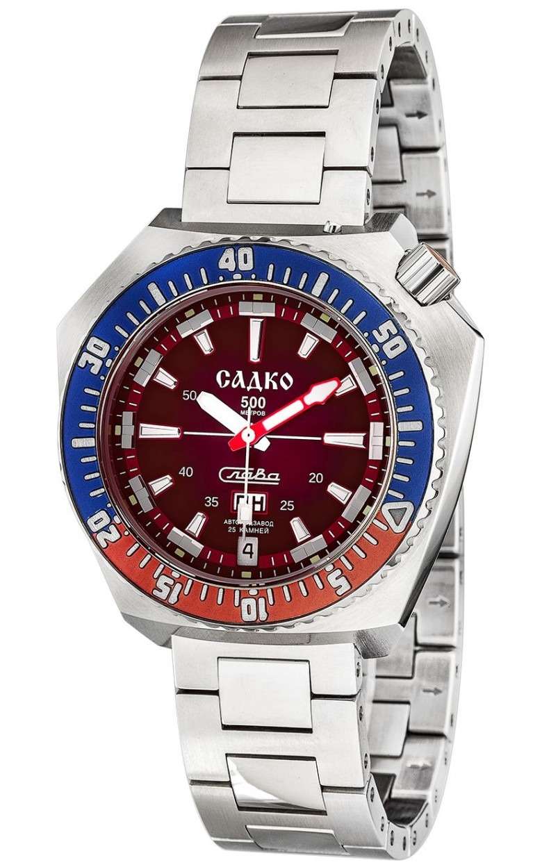 Стильные часы Слава Садко 5007170/100-2427 — станут надежным спутником как в повседневной жизни, так и при покорении морских глубин. Эти часы, созданные в России, оснащены механическим механизмом Слава 2427 с автоподзаводом, который обеспечивает точность и надежность. Корпус выполнен из высококачественной стали 316L. Поворотный безельБезельВнешний ободок, закрепляющий стекло. В спортивных часах так называется поворотное кольцо с делениями на циферблате, выполняет роль таймера – замеряет отрезки времени на шкале. Неподвижный безель – элемент декора. Однонаправленно вращающийся безель на дайверских часах позволяет фиксировать моменты погружения и выныривания на поверхность. часов с IP-покрытиемIP-покрытиеМетод ионного напыления. Демонстрирует повышенную устойчивость к истиранию, окислению и химическим веществам. Под воздействием высокого давления и температуры около 1500°C молекулы металла надёжно соединяются с частицами корпуса часов. красного и синего цвета придаёт модели особую элегантность и долговечность. Яркий красный циферблат с метками в виде штрихов надежно защищён сапфировым стекломСапфировое стеклоПрочный и надёжный материал из кристалла сапфира синтетического происхождения, характеризующийся особой твёрдостью и устойчивостью к царапинам и повреждениям., толщина которого составляет 3 мм. Заводная головка с защитой, расположенная в положении 2 часа, и литой стальной браслет с застежкой «бабочка»Застёжка "бабочка"Такой вид застёжки дополняется предохранителями, помогающими избежать случайного раскрытия браслета. Обладают изящным исполнением. обеспечивают комфорт и удобство в использовании. Эти часы имеют водозащиту 500WR, позволяя погружаться на глубину до 50 атмосфер, что делает их идеальными для дайвинга. Автоматический гелиевый клапан добавляет дополнительную надежность при подводных приключениях. Функциональность часов дополнена календарём с отображением числа и дня недели, который удобно расположен в позиции 6 часов. Кнопка быстрого перевода календаря делает настройку простой и лёгкой. Стрелки и метки обладают люминесцентным покрытиемЛюминесцентное покрытиеПозволяет считывать показания времени в темноте. Производители наносят на стрелки, часовые индексы, безель или поверхность циферблата светонакопительный состав, дающий холодное свечение., которое светится в темноте после зарядки на свету, обеспечивая отличную видимость в любых условиях. Каждый экземпляр из лимитированной серии в 500 штук уникален и имеет номер на задней крышке, украшенной объёмным изображением, выполненным методом чеканки. Механизм часов поддерживает 25 камней и работает с частотой 18000 полуколебаний в час, предлагая запас хода до 40 часов и возможность ручного завода. Противоударное устройство оси баланса добавляет уверенности в их долговечности. Эти часы — идеальный выбор для тех, кто ценит стиль, надежность и функциональность в одном аксессуаре.