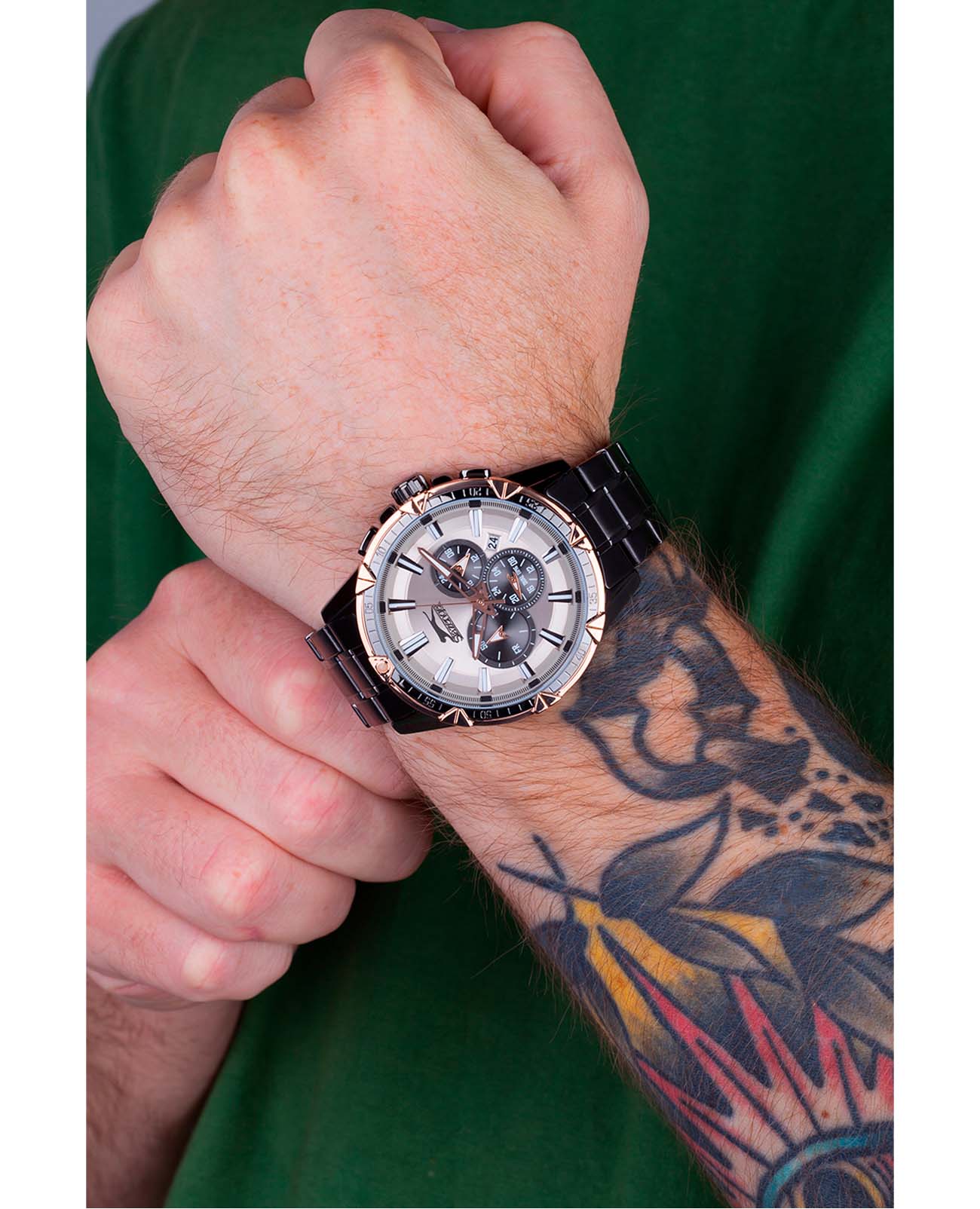 Циферблат серого цвета украшен стрелками с люминесцентным покрытиемЛюминесцентное покрытиеПозволяет считывать показания времени в темноте. Производители наносят на стрелки, часовые индексы, безель или поверхность циферблата светонакопительный состав, дающий холодное свечение., что обеспечивает читаемость времени даже в условиях слабого освещения. Для защиты циферблата используется минеральное стеклоМинеральное стеклоМинеральное стекло представляет собой искусственно выращенный минерал кварца. Такое стекло отличается особой устойчивостью к повреждениям и царапинам. Уступает по некоторым качествам сапфировому стеклу., устойчивое к царапинам и повреждениям. Браслет изготовлен из суперметалла с IP-покрытиемIP-покрытиеМетод ионного напыления. Демонстрирует повышенную устойчивость к истиранию, окислению и химическим веществам. Под воздействием высокого давления и температуры около 1500°C молекулы металла надёжно соединяются с частицами корпуса часов. на раскладной застежкойРаскладная застёжкаТакой тип застёжки используется только на браслетах из металла. Она никогда не раскрывается полностью, происходит разделение на 2 и более частей. Раскладывающая застёжка снизит вероятность потери часов к минимуму., гарантирующей удобство и надежность при ношении.