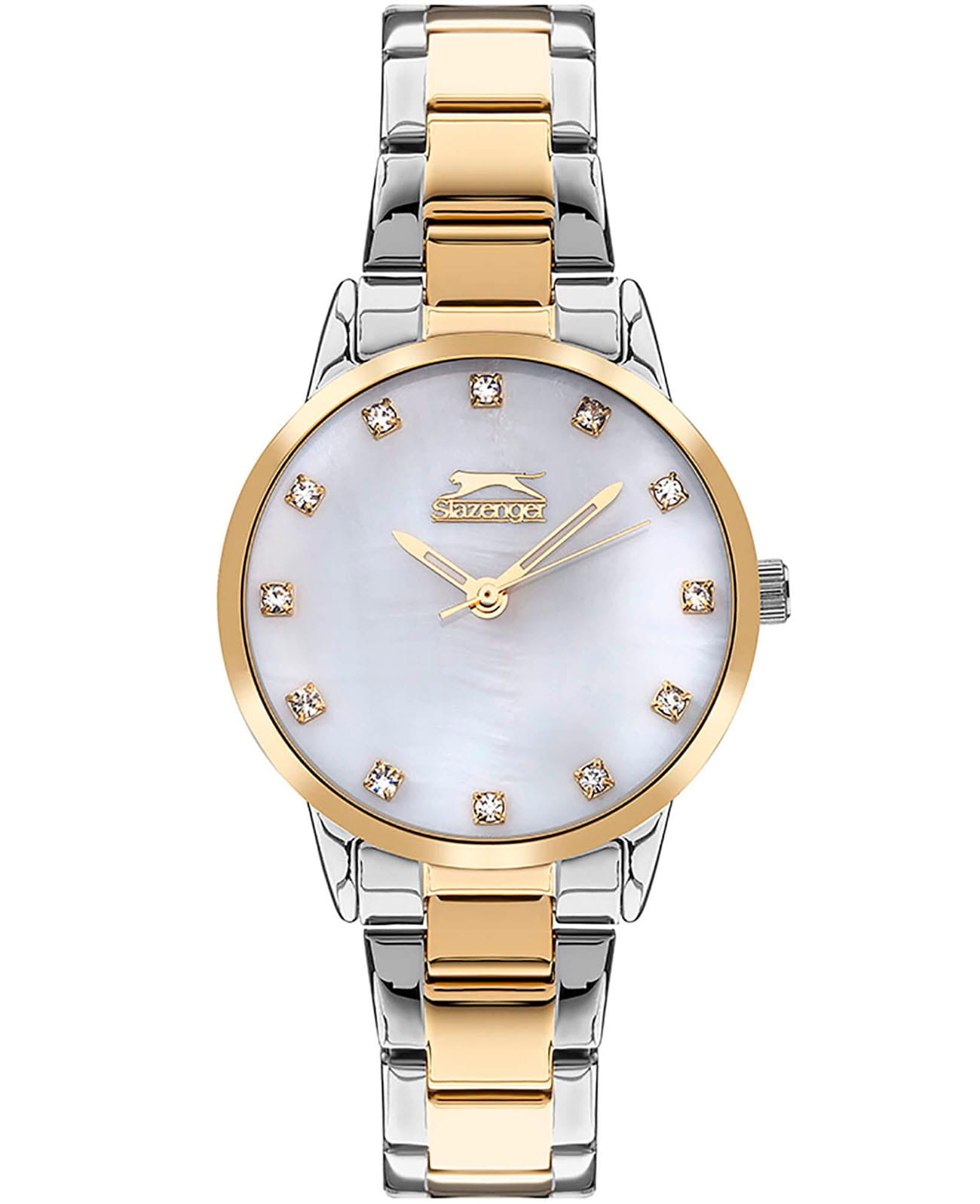 Женские наручные часы Slazenger SL.09.2071.3.07 сочетают в себе элегантный дизайн и практичность современных технологий. Модель обладает круглым корпусом диаметром 32 мм, изготовленным из стали, что обеспечивает высокую устойчивость к внешним воздействиям. Браслет выполнен из суперметалла с частичным IP-покрытиемIP-покрытиеМетод ионного напыления. Демонстрирует повышенную устойчивость к истиранию, окислению и химическим веществам. Под воздействием высокого давления и температуры около 1500°C молекулы металла надёжно соединяются с частицами корпуса часов., добавляя модели особую изысканность. Для защиты используется минеральное стеклоМинеральное стеклоМинеральное стекло представляет собой искусственно выращенный минерал кварца. Такое стекло отличается особой устойчивостью к повреждениям и царапинам. Уступает по некоторым качествам сапфировому стеклу., обеспечивающее прочную защиту от царапин. БезельБезельВнешний ободок, закрепляющий стекло. В спортивных часах так называется поворотное кольцо с делениями на циферблате, выполняет роль таймера – замеряет отрезки времени на шкале. Неподвижный безель – элемент декора. Однонаправленно вращающийся безель на дайверских часах позволяет фиксировать моменты погружения и выныривания на поверхность. с IP-покрытиемIP-покрытиеМетод ионного напыления. Демонстрирует повышенную устойчивость к истиранию, окислению и химическим веществам. Под воздействием высокого давления и температуры около 1500°C молекулы металла надёжно соединяются с частицами корпуса часов.. Часы работают на японском кварцевом механизме, гарантирующем точное время без необходимости подзаводки. Водонепроницаемость часов достигает 3 атмосфер (30 метров), что позволяет использовать их при контакте с брызгами воды, однако не рекомендуется для плавания или дайвинга. Вес часов составляет 76 грамм, делая их удобными для повседневного использования.