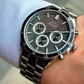 Мужские наручные часы Slazenger SL.09.2109.2.04 сочетают в себе классический дизайн и надежность современных технологий. Модель обладает круглым корпусом диаметром 45 мм, изготовленным из нержавеющей стали, что обеспечивает высокую устойчивость к внешним воздействиям. Браслет выполнен из металла суперметалл с раскладной застежкойРаскладной замокДанный вариант застежки используется только на часах с металлическим браслетом. Отличительная особенность такого крепления в том, что длина браслета становится универсальной и вы можете самостоятельно отрегулировать нужный вам размер – застежка просто двигается по браслету часов., гарантирующей комфортное ношение и безопасность. Циферблат черного цвета декорирован стрелками с люминесцентным покрытиемЛюминесцентное покрытиеПозволяет считывать показания времени в темноте. Производители наносят на стрелки, часовые индексы, безель или поверхность циферблата светонакопительный состав, дающий холодное свечение., которые обеспечивают читаемость времени даже при недостаточной освещенности, а также дополнен малыми циферблатами для отображения даты, дня недели и текущего времени в 24-часовом формате. Для защиты используется минеральное стеклоМинеральное стеклоМинеральное стекло представляет собой искусственно выращенный минерал кварца. Такое стекло отличается особой устойчивостью к повреждениям и царапинам. Уступает по некоторым качествам сапфировому стеклу., обеспечивающее прочную защиту от царапин. БезельБезельВнешний ободок, закрепляющий стекло. В спортивных часах так называется поворотное кольцо с делениями на циферблате, выполняет роль таймера – замеряет отрезки времени на шкале. Неподвижный безель – элемент декора. Однонаправленно вращающийся безель на дайверских часах позволяет фиксировать моменты погружения и выныривания на поверхность. с IP-покрытиемIP-покрытиеМетод ионного напыления. Демонстрирует повышенную устойчивость к истиранию, окислению и химическим веществам. Под воздействием высокого давления и температуры около 1500°C молекулы металла надёжно соединяются с частицами корпуса часов.. Часы работают на кварцевом механизме, что гарантирует точное время без необходимости подзаводки. Водонепроницаемость часов достигает 5 атмосфер (WR50), что позволяет использовать их во время плавания, однако они не предназначены для дайвинга или других водных видов спорта. Толщина модели составляет 12 мм. SL.09.2109.2.04 — это стильный аксессуар, который станет отличным дополнением как формального, так и casual образа мужчины.