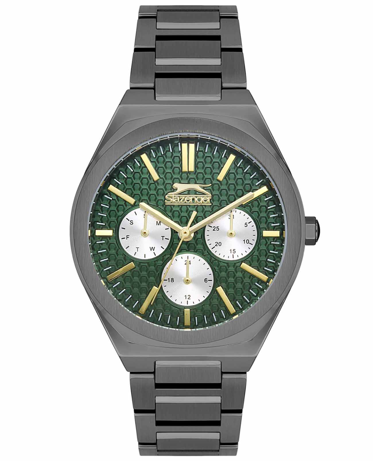 Элегантные женские часы Slazenger SL.09.2138.4.05 воплощают в себе утонченный стиль и функциональность. Их изящный круглый корпус из суперметалла с серым IP-покрытиемIP-покрытиеМетод ионного напыления. Демонстрирует повышенную устойчивость к истиранию, окислению и химическим веществам. Под воздействием высокого давления и температуры около 1500°C молекулы металла надёжно соединяются с частицами корпуса часов. гармонично сочетается с зеленым циферблатом и серебристыми малыми циферблатами, создавая неповторимый образ. Минималистичный дизайн подчеркивает чистоту линий и внимание к деталям. Циферблат защищен минеральным стекломМинеральное стеклоМинеральное стекло представляет собой искусственно выращенный минерал кварца. Такое стекло отличается особой устойчивостью к повреждениям и царапинам. Уступает по некоторым качествам сапфировому стеклу., устойчивым к царапинам. Часы имеют надежный кварцевый механизм, обеспечивающий точность хода.  Часы оснащены  24-часовым указателем времени, а также дней недели и даты - на дополнительных малых циферблатах. Серый браслет из суперметалла IP-покрытиемIP-покрытиеМетод ионного напыления. Демонстрирует повышенную устойчивость к истиранию, окислению и химическим веществам. Под воздействием высокого давления и температуры около 1500°C молекулы металла надёжно соединяются с частицами корпуса часов. идеально облегает запястье. Модель прекрасно дополнит как деловой, так и повседневный образ, став незаменимым аксессуаром для современной женщины, ценящей качество и стиль.
