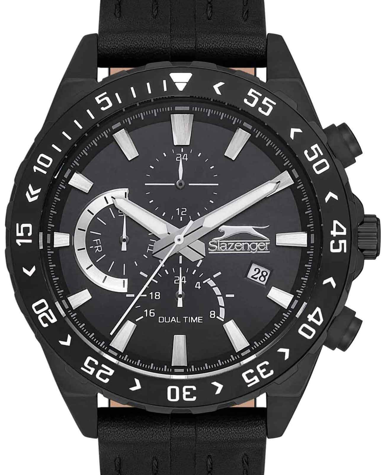 Slazenger SL.09.2152.2.03 – это великолепное сочетание стиля и функциональности, созданное для тех, кто ценит элегантность и надежность. Эти наручные часы работают на кварцевом механизме, обеспечивая точность и долговечность. Корпус и безельБезельВнешний ободок, закрепляющий стекло. В спортивных часах так называется поворотное кольцо с делениями на циферблате, выполняет роль таймера – замеряет отрезки времени на шкале. Неподвижный безель – элемент декора. Однонаправленно вращающийся безель на дайверских часах позволяет фиксировать моменты погружения и выныривания на поверхность. выполнены из прочного суперметалла с черным IP-покрытиемIP-покрытиеМетод ионного напыления. Демонстрирует повышенную устойчивость к истиранию, окислению и химическим веществам. Под воздействием высокого давления и температуры около 1500°C молекулы металла надёжно соединяются с частицами корпуса часов., что придает часам современный и утонченный вид. Черный циферблат, оформленный в технике Sunray, украшен логотипом бренда и часовыми метками в виде штрихов, что добавляет аксессуару изысканности. Особенностью данной модели является наличие календаря, отображающего дату и день недели, а также возможность следить за временем во втором часовом поясе. Все это удобно размещено на отдельных циферблатах, что делает использование часов максимально комфортным. Рифленая заводная головка снабжена защитой, что обеспечивает дополнительную надежность. Часы также обладают водозащитой на уровне 50WR, что позволяет им выдерживать воздействие воды в повседневных ситуациях. Минеральное стеклоМинеральное стеклоМинеральное стекло представляет собой искусственно выращенный минерал кварца. Такое стекло отличается особой устойчивостью к повреждениям и царапинам. Уступает по некоторым качествам сапфировому стеклу. защищает циферблат от царапин и повреждений, сохраняя его внешний вид безупречным. Люминесцентное покрытиеЛюминесцентное покрытиеПозволяет считывать показания времени в темноте. Производители наносят на стрелки, часовые индексы, безель или поверхность циферблата светонакопительный состав, дающий холодное свечение. на стрелках обеспечивает отличную видимость в темноте. Завершающим штрихом образа является кожаный ремешок с классической застежкой, который обеспечивает удобную посадку на запястье и добавляет модели роскошный акцент.