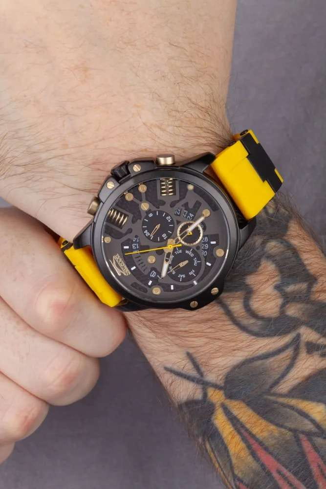 Часы Slazenger SL.09.2212.2.04 представляют собой стильный и функциональный аксессуар, созданный для современных мужчин, ценящих качество и надежность. Они оснащены кварцевым механизмом, который обеспечивает точность хода и минимальную необходимость в обслуживании. Люминесцентное покрытиеЛюминесцентное покрытиеПозволяет считывать показания времени в темноте. Производители наносят на стрелки, часовые индексы, безель или поверхность циферблата светонакопительный состав, дающий холодное свечение. на стрелках и метках обеспечивает отличную видимость в темноте. Благодаря водозащите уровня WR 50 (5 ATM), эти часы отлично справляются с воздействием влаги, что делает их подходящими для повседневного ношения и активного образа жизни. Минеральное стеклоМинеральное стеклоМинеральное стекло представляет собой искусственно выращенный минерал кварца. Такое стекло отличается особой устойчивостью к повреждениям и царапинам. Уступает по некоторым качествам сапфировому стеклу. защищает циферблат от царапин и повреждений, гарантируя долгий срок службы. Корпус часов диаметром 47 мм и толщиной 13 мм выполнен из прочного суперметалла с черным IP-покрытиемIP-покрытиеМетод ионного напыления. Демонстрирует повышенную устойчивость к истиранию, окислению и химическим веществам. Под воздействием высокого давления и температуры около 1500°C молекулы металла надёжно соединяются с частицами корпуса часов., что придаёт им стильный и современный вид. Силиконовый желтый браслет, дополненный элементами из суперметалла с черным IP-покрытиемIP-покрытиеМетод ионного напыления. Демонстрирует повышенную устойчивость к истиранию, окислению и химическим веществам. Под воздействием высокого давления и температуры около 1500°C молекулы металла надёжно соединяются с частицами корпуса часов., обеспечивает комфорт при носке и надёжно фиксирует часы на запястье, а его размеры (22-20 мм) подходят для большинства мужчин. Часы оснащены рядом полезных функций, таких как индикация даты, дня недели и 24-часовой указатель времени, что делает их не только стильным, но и практичным аксессуаром. Вес модели составляет 110 г, что делает их лёгкими и удобными для ежедневного ношения.