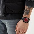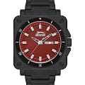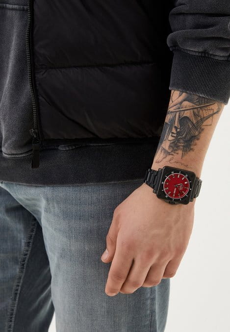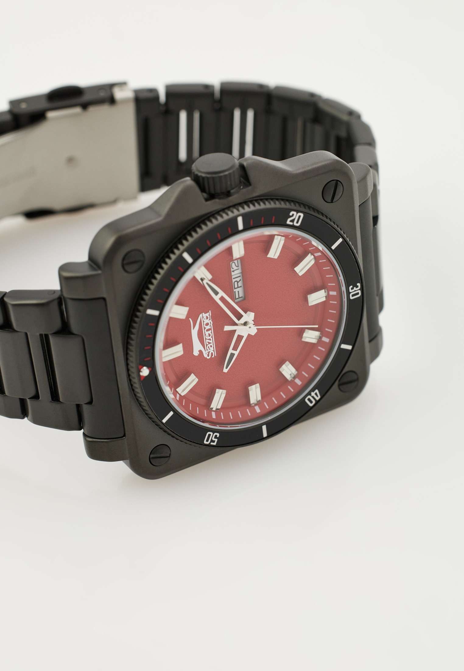 Часы Slazenger SL.09.2232.1.05 — это современная модель, сочетающая стиль и практичность. Корпус квадратной формы выполнен из прочного металла с черным IP-покрытиемIP-покрытиеМетод ионного напыления. Демонстрирует повышенную устойчивость к истиранию, окислению и химическим веществам. Под воздействием высокого давления и температуры около 1500°C молекулы металла надёжно соединяются с частицами корпуса часов., а круглый красный циферблат придает дизайну особую выразительность. На вращающийся безельБезельВнешний ободок, закрепляющий стекло. В спортивных часах так называется поворотное кольцо с делениями на циферблате, выполняет роль таймера – замеряет отрезки времени на шкале. Неподвижный безель – элемент декора. Однонаправленно вращающийся безель на дайверских часах позволяет фиксировать моменты погружения и выныривания на поверхность. нанесено черное IP-покрытиеIP-покрытиеМетод ионного напыления. Демонстрирует повышенную устойчивость к истиранию, окислению и химическим веществам. Под воздействием высокого давления и температуры около 1500°C молекулы металла надёжно соединяются с частицами корпуса часов.. Черный металлический браслет с IP-покрытиемIP-покрытиеМетод ионного напыления. Демонстрирует повышенную устойчивость к истиранию, окислению и химическим веществам. Под воздействием высокого давления и температуры около 1500°C молекулы металла надёжно соединяются с частицами корпуса часов. снабжен надежной раскладной застёжкойРаскладная застёжкаТакой тип застёжки используется только на браслетах из металла. Она никогда не раскрывается полностью, происходит разделение на 2 и более частей. Раскладывающая застёжка снизит вероятность потери часов к минимуму., обеспечивающей удобство при повседневном ношении. Модель оснащена кварцевым механизмом, минеральное стеклоМинеральное стеклоМинеральное стекло представляет собой искусственно выращенный минерал кварца. Такое стекло отличается особой устойчивостью к повреждениям и царапинам. Уступает по некоторым качествам сапфировому стеклу., защищающим от случайных повреждений, и водозащитой уровня WR 50, позволяющей не бояться контакта с водой в повседневных ситуациях. На циферблате расположены окошки даты и дня недели. Для удобства использования в темное время суток предусмотрено люминесцентное покрытиеЛюминесцентное покрытиеПозволяет считывать показания времени в темноте. Производители наносят на стрелки, часовые индексы, безель или поверхность циферблата светонакопительный состав, дающий холодное свечение. стрелок. Заводная головка дополнительно защищена от случайных нажатий. Габариты корпуса составляют 43 на 43 мм, толщина — 11 мм.