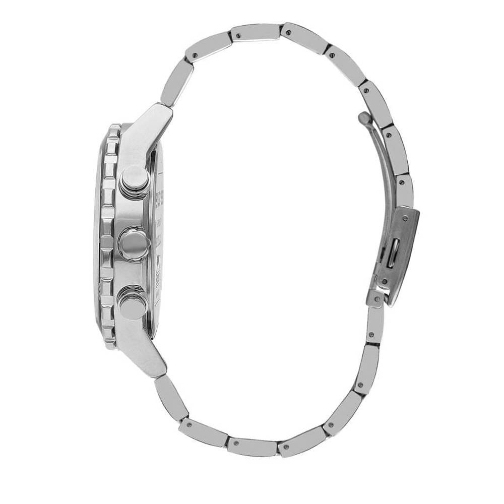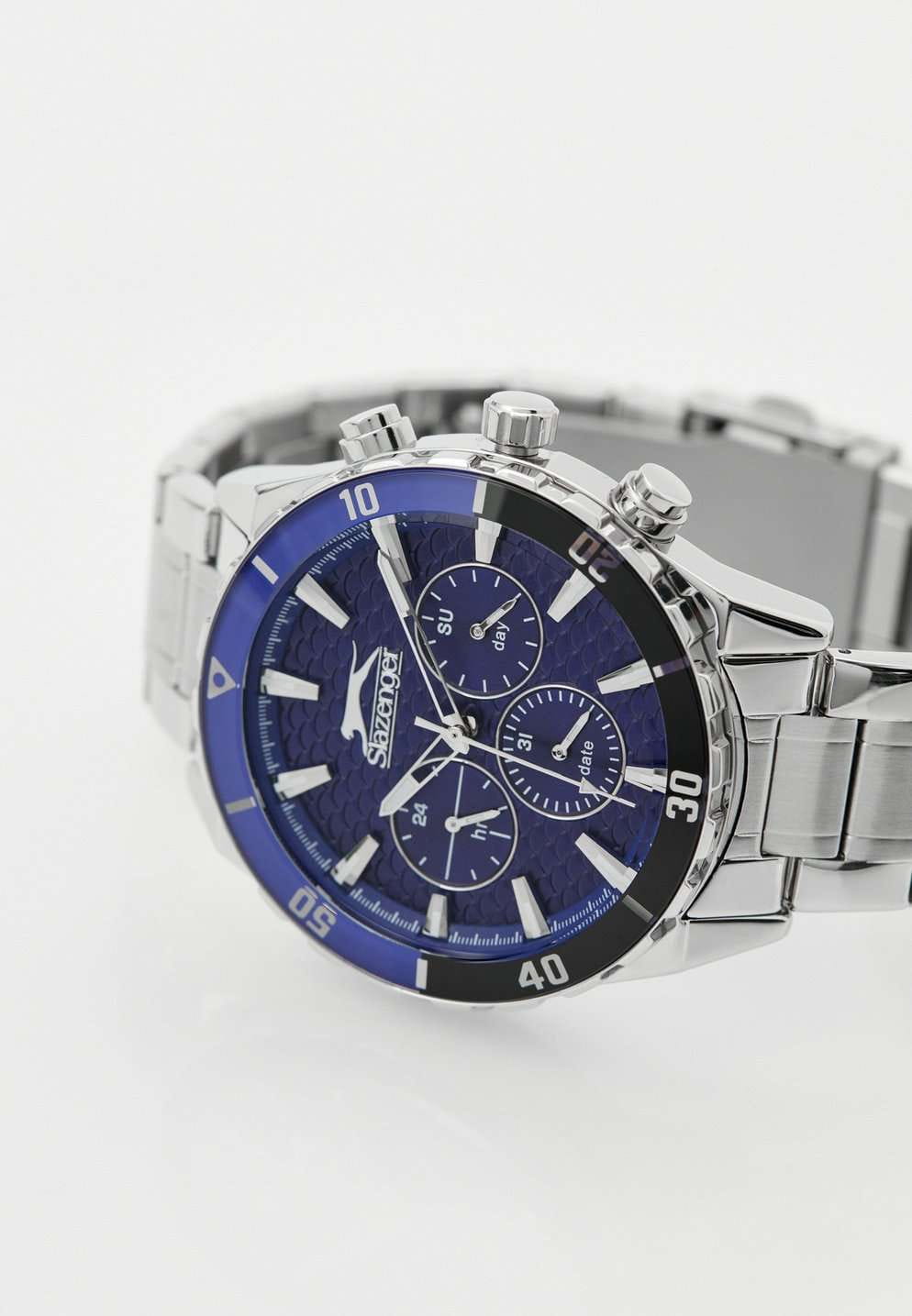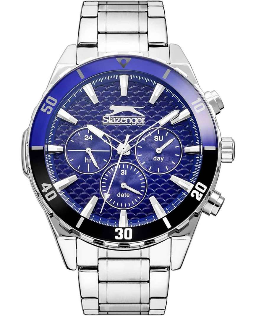 Часы Slazenger SL.09.2236.2.06 — это стильная и надежная модель, которая станет отличным выбором для активного современного мужчины. Крупный корпус диаметром 46 мм выполнен из прочного металла, а серебристый металлический браслет оснащён удобной раскладной застёжкойРаскладная застёжкаТакой тип застёжки используется только на браслетах из металла. Она никогда не раскрывается полностью, происходит разделение на 2 и более частей. Раскладывающая застёжка снизит вероятность потери часов к минимуму., что обеспечивает комфорт при повседневном ношении. На безельБезельВнешний ободок, закрепляющий стекло. В спортивных часах так называется поворотное кольцо с делениями на циферблате, выполняет роль таймера – замеряет отрезки времени на шкале. Неподвижный безель – элемент декора. Однонаправленно вращающийся безель на дайверских часах позволяет фиксировать моменты погружения и выныривания на поверхность. нанесено черное и синее IP-покрытиеIP-покрытиеМетод ионного напыления. Демонстрирует повышенную устойчивость к истиранию, окислению и химическим веществам. Под воздействием высокого давления и температуры около 1500°C молекулы металла надёжно соединяются с частицами корпуса часов.. Минеральное стеклоМинеральное стеклоМинеральное стекло представляет собой искусственно выращенный минерал кварца. Такое стекло отличается особой устойчивостью к повреждениям и царапинам. Уступает по некоторым качествам сапфировому стеклу. защищает текстурированный синий циферблат от случайных царапин, а водозащита уровня WR 50 позволяет не переживать о попадании влаги при контакте с водой. На циферблате расположены дополнительные малые циферблаты с отображением даты, дня недели и времени в 24-часовом формате, что делает использование часов максимально функциональным. Для удобства использования в темное время суток предусмотрено люминесцентное покрытиеЛюминесцентное покрытиеПозволяет считывать показания времени в темноте. Производители наносят на стрелки, часовые индексы, безель или поверхность циферблата светонакопительный состав, дающий холодное свечение. стрелок. Толщина корпуса составляет 13 мм, вес часов — 152 грамма.