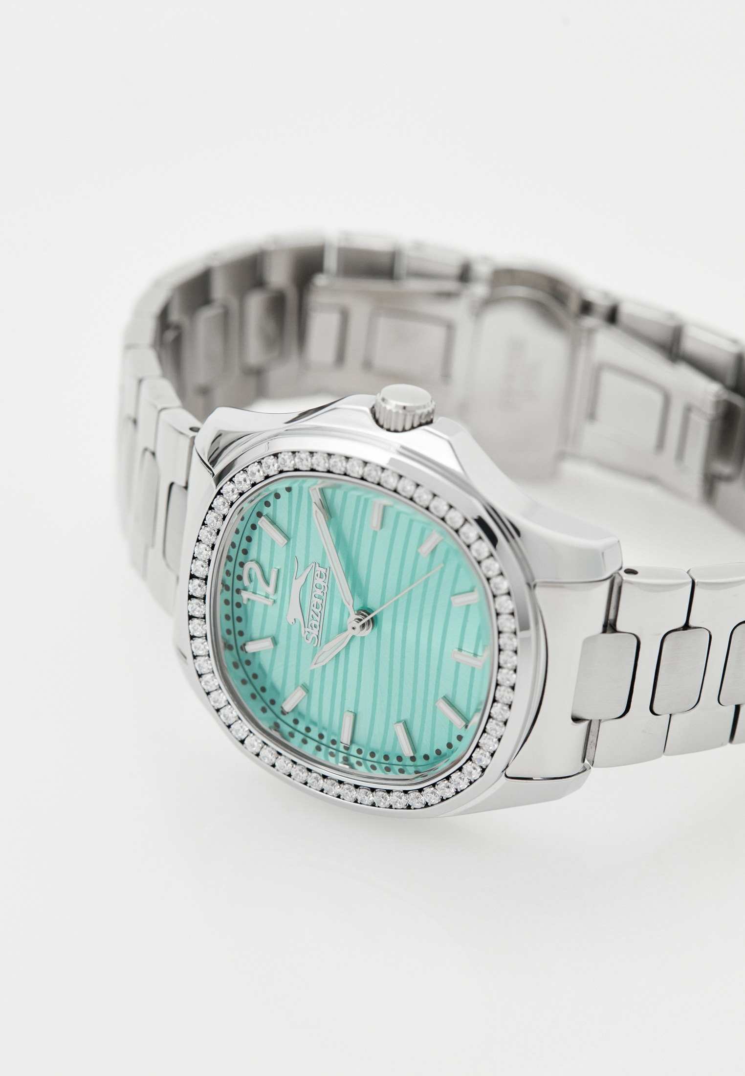 Часы Slazenger SL.09.2238.3.07 – это изысканный аксессуар, который станет стильным акцентом любого образа. Модель оснащена надежным кварцевым механизмом. Корпус из прочного металла размером 34х34 мм украшен россыпью сверкающих фианитов по безелюБезельВнешний ободок, закрепляющий стекло. В спортивных часах так называется поворотное кольцо с делениями на циферблате, выполняет роль таймера – замеряет отрезки времени на шкале. Неподвижный безель – элемент декора. Однонаправленно вращающийся безель на дайверских часах позволяет фиксировать моменты погружения и выныривания на поверхность., что придает часам особое сияние и элегантность. Голубой циферблат с логотипом бренда защищен стойким к царапинам минеральным стекломМинеральное стеклоМинеральное стекло представляет собой искусственно выращенный минерал кварца. Такое стекло отличается особой устойчивостью к повреждениям и царапинам. Уступает по некоторым качествам сапфировому стеклу.. Четкие часовые метки в виде лаконичных штрихов и крупная арабская цифра 12 обеспечивают удобство чтения времени. Заводная головка с рифлением дополнена защитой для повышения долговечности. Металлический браслет шириной 18 мм надежно фиксируется на запястье с помощью застежки «бабочка»Застёжка "бабочка"Такой вид застёжки дополняется предохранителями, помогающими избежать случайного раскрытия браслета. Обладают изящным исполнением. . Для удобства использования в темное время суток предусмотрено люминесцентное покрытиеЛюминесцентное покрытиеПозволяет считывать показания времени в темноте. Производители наносят на стрелки, часовые индексы, безель или поверхность циферблата светонакопительный состав, дающий холодное свечение. стрелок. Водозащита 30WR позволяет не беспокоиться о случайных брызгах. Вес изделия составляет 92 грамма, что делает часы комфортными для ежедневного ношения. Эти часы идеально подойдут для тех, кто ценит гармонию стиля, качества и функциональности.