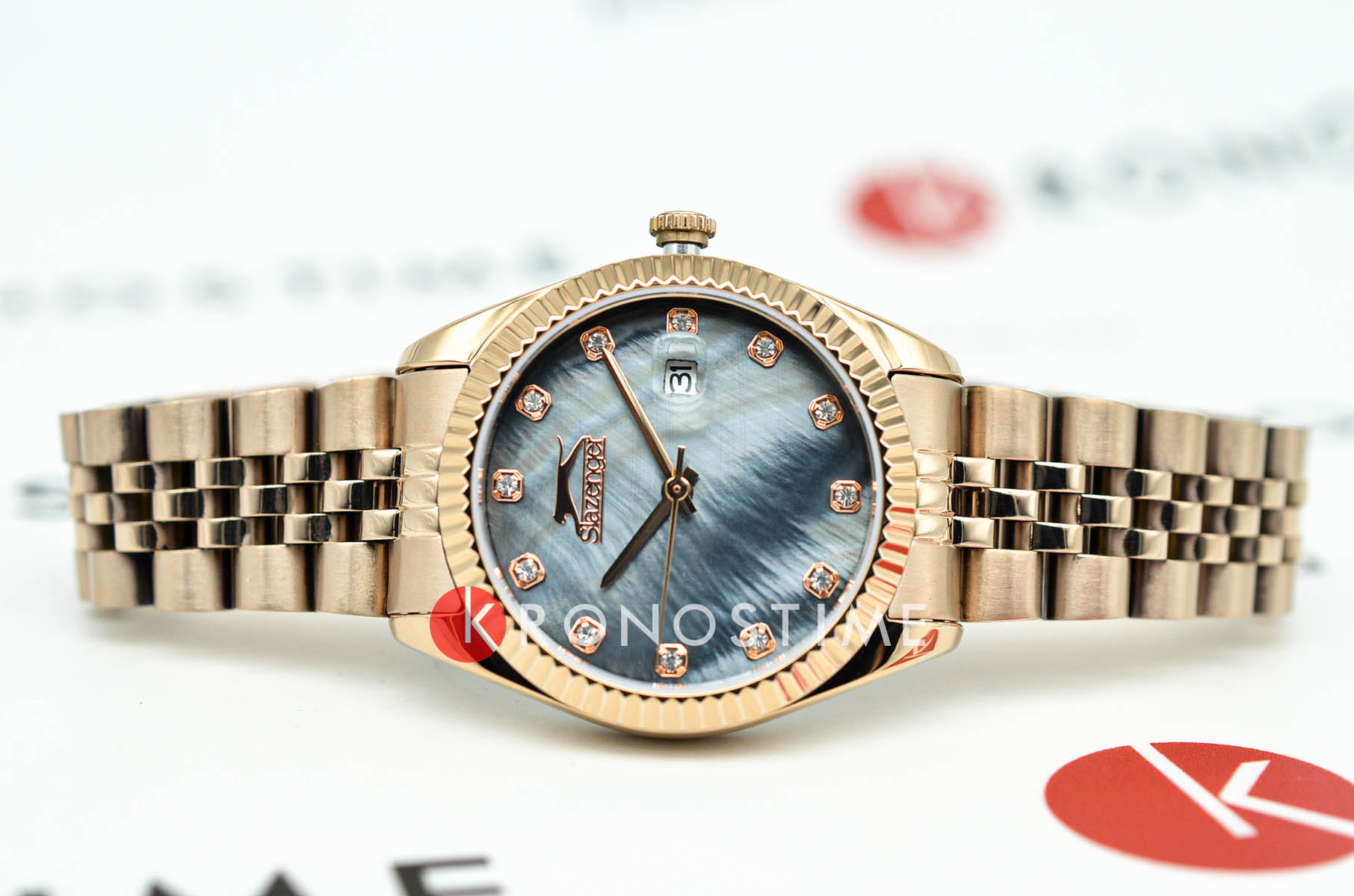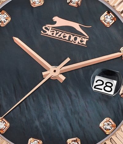 Эти женские часы Slazenger SL.09.2240.3.05 сочетают стильный дизайн и практичность. Корпус, браслет и рифленый безельБезельВнешний ободок, закрепляющий стекло. В спортивных часах так называется поворотное кольцо с делениями на циферблате, выполняет роль таймера – замеряет отрезки времени на шкале. Неподвижный безель – элемент декора. Однонаправленно вращающийся безель на дайверских часах позволяет фиксировать моменты погружения и выныривания на поверхность. выполнены из прочного металла золотистого цвета с IP-покрытиемIP-покрытиеМетод ионного напыления. Демонстрирует повышенную устойчивость к истиранию, окислению и химическим веществам. Под воздействием высокого давления и температуры около 1500°C молекулы металла надёжно соединяются с частицами корпуса часов., что придает аксессуару элегантный и современный вид. Черный перламутровый циферблат украшен кристаллами, что добавляет часам изысканности и утонченности, также он дополнен функцией календаря, отображающей число месяца. Модель оснащена кварцевым механизмом, который обеспечивает точность хода, а также функцией отображения даты с увеличительным стеклом для удобства просмотра. Минеральное стеклоМинеральное стеклоМинеральное стекло представляет собой искусственно выращенный минерал кварца. Такое стекло отличается особой устойчивостью к повреждениям и царапинам. Уступает по некоторым качествам сапфировому стеклу. защищает циферблат от царапин, водозащита уровня WR 30 позволяет выдерживать случайные брызги воды. Удобная раскладная застёжкаРаскладная застёжкаТакой тип застёжки используется только на браслетах из металла. Она никогда не раскрывается полностью, происходит разделение на 2 и более частей. Раскладывающая застёжка снизит вероятность потери часов к минимуму. обеспечивает надежную фиксацию на запястье. Диаметр корпуса составляет 32 мм, ширина браслета — 16 мм, толщина корпуса — 9 мм, вес часов — 80 граммов. В комплект входит фирменная упаковка, инструкция на русском языке и гарантийный талон. Гарантия на изделие составляет 1 год.