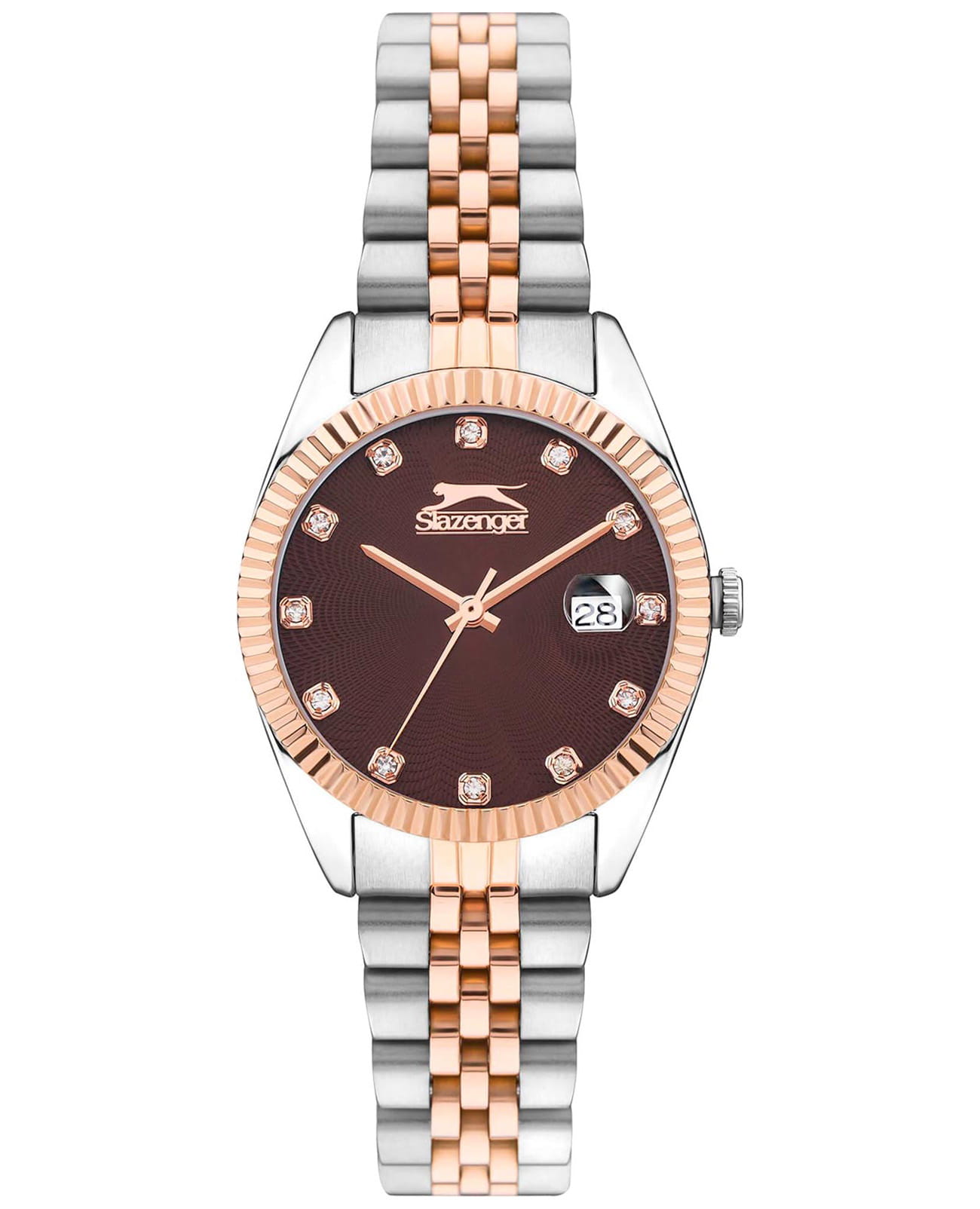 Женские наручные часы Slazenger SL.09.2240.3.07 сочетают в себе классический дизайн и надежность современных технологий. Модель обладает круглым корпусом диаметром 32 мм, изготовленным из суперметалла, что обеспечивает высокую устойчивость к внешним воздействиям. Циферблат коричневого цвета декорирован золотистыми стрелками и индексами, которые обеспечивают читаемость времени даже в условиях недостаточной освещенности. Индексы украшены фианитами. Браслет выполнен из суперметалла с частичным розовым IP-покрытиемIP-покрытиеМетод ионного напыления. Демонстрирует повышенную устойчивость к истиранию, окислению и химическим веществам. Под воздействием высокого давления и температуры около 1500°C молекулы металла надёжно соединяются с частицами корпуса часов., он имеет раскладную застежкуРаскладной замокДанный вариант застежки используется только на часах с металлическим браслетом. Отличительная особенность такого крепления в том, что длина браслета становится универсальной и вы можете самостоятельно отрегулировать нужный вам размер – застежка просто двигается по браслету часов., гарантирующую комфортное ношение и безопасность. Для защиты используется минеральное стеклоМинеральное стеклоМинеральное стекло представляет собой искусственно выращенный минерал кварца. Такое стекло отличается особой устойчивостью к повреждениям и царапинам. Уступает по некоторым качествам сапфировому стеклу., обеспечивающее прочную защиту от царапин. Часы работают на кварцевом механизме, что гарантирует точное время без необходимости подзаводки. Водонепроницаемость часов достигает 3 атмосфер, что позволяет использовать их при мытье рук или хождении под мелким дождем, однако не рекомендуется для плавания или других водных видов спорта. Вес модели составляет 80 граммов.