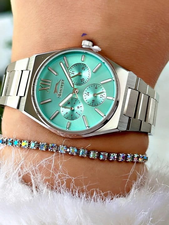 Часы Slazenger SL.09.2243.4.05 сочетают в себе элегантный дизайн и практичность для повседневного использования. Модель выполнена в изысканном серебряном цвете, корпус и браслет изготовлены из прочного металла, что обеспечивает надежность и долговечность изделия. Кварцевый механизм гарантирует точность хода, а минеральное стеклоМинеральное стеклоМинеральное стекло представляет собой искусственно выращенный минерал кварца. Такое стекло отличается особой устойчивостью к повреждениям и царапинам. Уступает по некоторым качествам сапфировому стеклу. защищает бирюзовый циферблат от механических повреждений. Диаметр корпуса составляет 34 мм, толщина — 9 мм, ширина ремешка — 20 мм, а общий вес часов — всего 87 грамм, что делает их легкими и комфортными на руке. Уровень водозащиты WR 30 позволяет не беспокоиться о случайных брызгах. Для удобства использования в темное время суток предусмотрено люминесцентное покрытиеЛюминесцентное покрытиеПозволяет считывать показания времени в темноте. Производители наносят на стрелки, часовые индексы, безель или поверхность циферблата светонакопительный состав, дающий холодное свечение. стрелок и меток. Дополнительные малые циферблаты отображают дату, день недели и время в 24-часовом формате. Часы оснащены металлическим браслетом с надежной раскладной застёжкойРаскладная застёжкаТакой тип застёжки используется только на браслетах из металла. Она никогда не раскрывается полностью, происходит разделение на 2 и более частей. Раскладывающая застёжка снизит вероятность потери часов к минимуму..