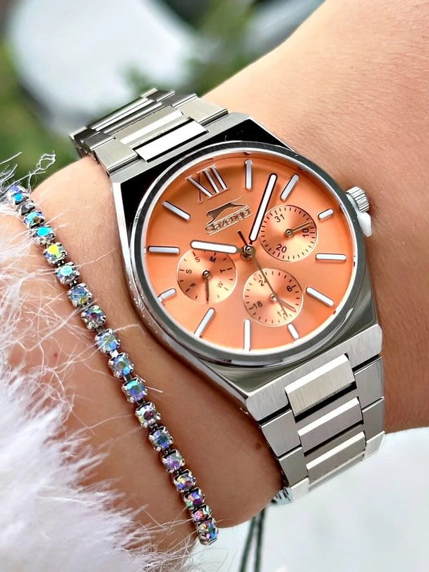 Часы Slazenger SL.09.2243.4.07 сочетают в себе элегантный дизайн и практичность для повседневного использования. Модель выполнена в изысканном серебряном цвете, корпус и браслет изготовлены из прочного металла, что обеспечивает надежность и долговечность изделия. Кварцевый механизм гарантирует точность хода, а минеральное стеклоМинеральное стеклоМинеральное стекло представляет собой искусственно выращенный минерал кварца. Такое стекло отличается особой устойчивостью к повреждениям и царапинам. Уступает по некоторым качествам сапфировому стеклу. защищает оранжевый циферблат от механических повреждений. Диаметр корпуса составляет 34 мм, толщина — 9 мм, ширина ремешка — 20 мм, а общий вес часов — всего 87 грамм, что делает их легкими и комфортными на руке. Уровень водозащиты WR 30 позволяет не беспокоиться о случайных брызгах. Для удобства использования в темное время суток предусмотрено люминесцентное покрытиеЛюминесцентное покрытиеПозволяет считывать показания времени в темноте. Производители наносят на стрелки, часовые индексы, безель или поверхность циферблата светонакопительный состав, дающий холодное свечение. стрелок и меток. Дополнительные малые циферблаты отображают дату, день недели и время в 24-часовом формате. Часы оснащены металлическим браслетом с надежной раскладной застёжкойРаскладная застёжкаТакой тип застёжки используется только на браслетах из металла. Она никогда не раскрывается полностью, происходит разделение на 2 и более частей. Раскладывающая застёжка снизит вероятность потери часов к минимуму..