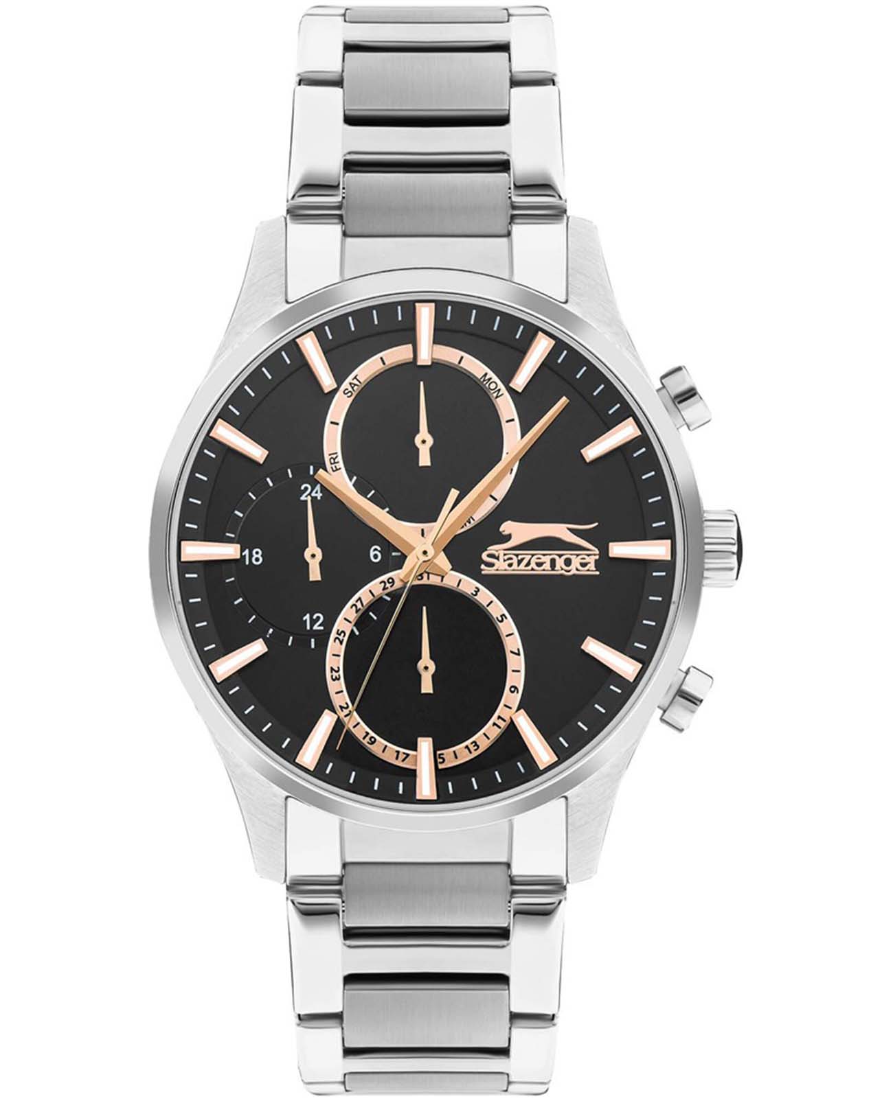 Часы Slazenger SL.09.2283.2.02 — это стильный и надежный аксессуар, который подчеркивает индивидуальность своего владельца. Корпус и браслет выполнены из прочного суперметалла — инновационного сплава на основе меди с пониженным содержанием цинка и никеля, дополненного специальным покрытием для долговечности и эстетики. Черный циферблат надежно защищен минеральным стекломМинеральное стеклоМинеральное стекло представляет собой искусственно выращенный минерал кварца. Такое стекло отличается особой устойчивостью к повреждениям и царапинам. Уступает по некоторым качествам сапфировому стеклу., устойчивым к царапинам и механическим повреждениям. Модель оснащена кварцевым механизмом, что гарантирует высокую точность хода. На отдельные циферблаты вынесены указатели 24-часового времени, даты и дня недели, что делает использование часов особенно удобным в повседневной жизни. Стальной браслет с раскладной застёжкойРаскладная застёжкаТакой тип застёжки используется только на браслетах из металла. Она никогда не раскрывается полностью, происходит разделение на 2 и более частей. Раскладывающая застёжка снизит вероятность потери часов к минимуму. обеспечивает комфортную посадку. Водозащита 5 АТМ позволяет не беспокоиться о случайных брызгах или дожде. Метки с люминесцентным покрытиемЛюминесцентное покрытиеПозволяет считывать показания времени в темноте. Производители наносят на стрелки, часовые индексы, безель или поверхность циферблата светонакопительный состав, дающий холодное свечение. удобно подсвечиваются в темноте после зарядки на свету. Диаметр корпуса составляет 43 мм, толщина — 13 мм, что обеспечивает комфортное ношение на запястье. Часы станут отличным выбором для повседневного использования или дополнения к деловому образу, а также послужат отличным подарком на любой праздник.