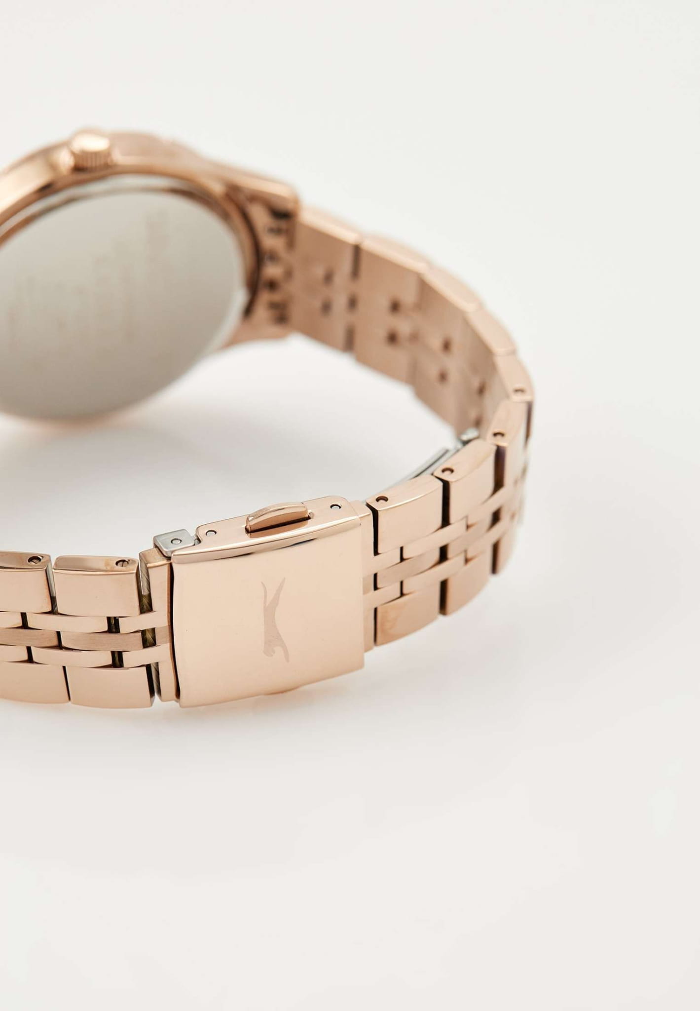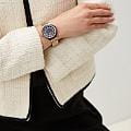 Женские наручные часы Slazenger SL.09.2295.3.05 — это элегантный аксессуар, который подчеркнет утончённый стиль своей обладательницы. Корпус диаметром 36 мм и толщиной 11,5 мм выполнен из прочного металла с розово-золотистым IP-покрытиемIP-покрытиеМетод ионного напыления. Демонстрирует повышенную устойчивость к истиранию, окислению и химическим веществам. Под воздействием высокого давления и температуры около 1500°C молекулы металла надёжно соединяются с частицами корпуса часов. и надёжно защищён минеральным стекломМинеральное стеклоМинеральное стекло представляет собой искусственно выращенный минерал кварца. Такое стекло отличается особой устойчивостью к повреждениям и царапинам. Уступает по некоторым качествам сапфировому стеклу., устойчивым к царапинам. Синий циферблат украшен изящными кристаллами, придающими часам особый блеск и изысканность. Модель оснащена люминесцентным покрытиемЛюминесцентное покрытиеПозволяет считывать показания времени в темноте. Производители наносят на стрелки, часовые индексы, безель или поверхность циферблата светонакопительный состав, дающий холодное свечение. стрелок, что облегчает считывание времени в темноте. Особое внимание привлекает безельБезельВнешний ободок, закрепляющий стекло. В спортивных часах так называется поворотное кольцо с делениями на циферблате, выполняет роль таймера – замеряет отрезки времени на шкале. Неподвижный безель – элемент декора. Однонаправленно вращающийся безель на дайверских часах позволяет фиксировать моменты погружения и выныривания на поверхность. с синим IP-покрытиемIP-покрытиеМетод ионного напыления. Демонстрирует повышенную устойчивость к истиранию, окислению и химическим веществам. Под воздействием высокого давления и температуры около 1500°C молекулы металла надёжно соединяются с частицами корпуса часов.. Металлический браслет с розово-золотистым IP-покрытиемIP-покрытиеМетод ионного напыления. Демонстрирует повышенную устойчивость к истиранию, окислению и химическим веществам. Под воздействием высокого давления и температуры около 1500°C молекулы металла надёжно соединяются с частицами корпуса часов. шириной 16 мм оснащён удобной раскладной застёжкойРаскладная застёжкаТакой тип застёжки используется только на браслетах из металла. Она никогда не раскрывается полностью, происходит разделение на 2 и более частей. Раскладывающая застёжка снизит вероятность потери часов к минимуму. для комфортной посадки на запястье. Кварцевый механизм обеспечивает точность хода, а водозащита уровня WR 30 защищает часы от случайных брызг. Для удобства в условиях плохой освещённости предусмотрена подсветка стрелок. Вес изделия составляет 95 граммов.