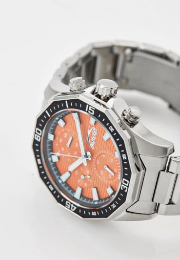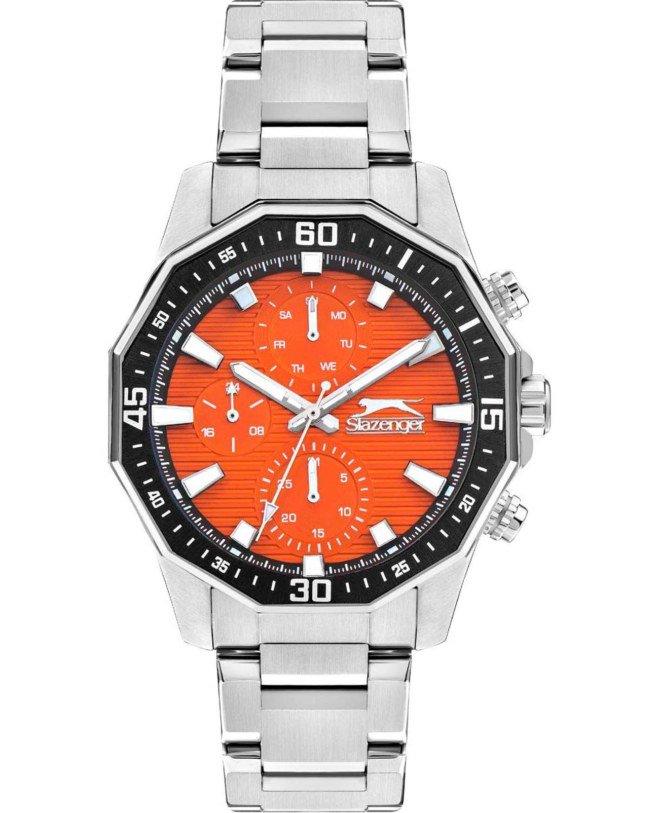Мужские кварцевые часы Slazenger SL.09.2297.2.06 — это выразительный и функциональный аксессуар, сочетающий прочность, стиль и насыщенную комплектацию. Корпус из суперметалла защищён минеральным стекломМинеральное стеклоМинеральное стекло представляет собой искусственно выращенный минерал кварца. Такое стекло отличается особой устойчивостью к повреждениям и царапинам. Уступает по некоторым качествам сапфировому стеклу.. Циферблат оранжевого цвета оформлен с вынесенными индикаторами: даты, дня недели и 24-часового формата времени. Стрелки и метки покрыты люминесцентным покрытиемЛюминесцентное покрытиеПозволяет считывать показания времени в темноте. Производители наносят на стрелки, часовые индексы, безель или поверхность циферблата светонакопительный состав, дающий холодное свечение., что обеспечивает хорошую читаемость в темноте. Браслет выполнен из суперметалла на раскладной застёжкеРаскладная застёжкаТакой тип застёжки используется только на браслетах из металла. Она никогда не раскрывается полностью, происходит разделение на 2 и более частей. Раскладывающая застёжка снизит вероятность потери часов к минимуму., обеспечивая надёжность и комфорт ношения. Водонепроницаемость 50 м позволяет использовать часы в повседневных условиях, защищая от случайных брызг и капель дождя. Модель подчёркивает индивидуальность и уверенность владельца, оставаясь универсальным выбором для повседневного и торжественного образа.