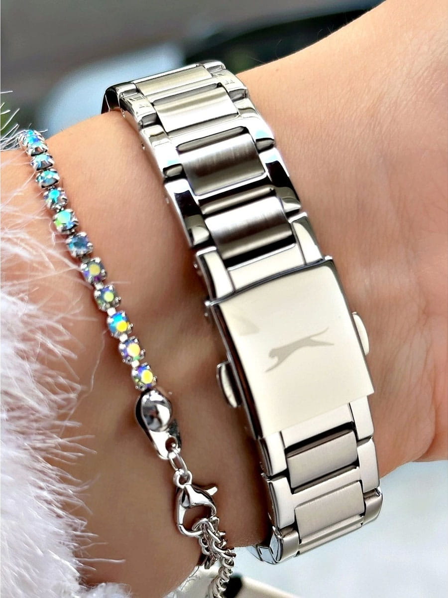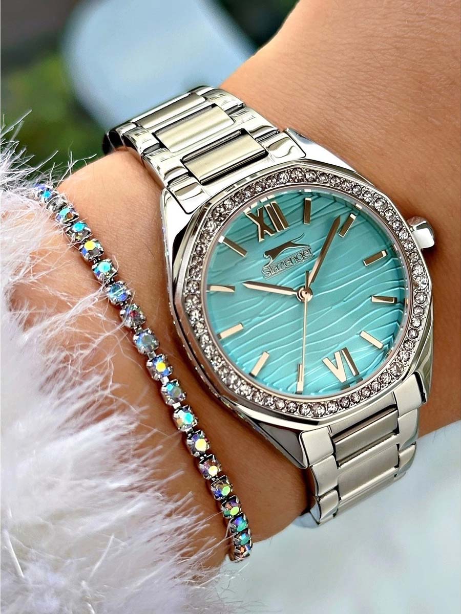 Женские кварцевые часы Slazenger SL.09.2301.3.01 — это элегантный и изысканный аксессуар, подчеркивающий стиль и утончённость. Корпус и браслет выполнены из суперметалла, защищён минеральным стекломМинеральное стеклоМинеральное стекло представляет собой искусственно выращенный минерал кварца. Такое стекло отличается особой устойчивостью к повреждениям и царапинам. Уступает по некоторым качествам сапфировому стеклу.. Циферблат мятного цвета с волнистым рельефным рисунком оформлен штриховыми метками и римскими цифрами VI и XII, дополнен логотипом бренда. Безель гранёный, украшен паве из фианитов, придающих модели изысканное сияние. Заводная головка — граненая, добавляющая детали дизайна. Браслет из суперметалла фиксируется на раскладной застёжкеРаскладная застёжкаТакой тип застёжки используется только на браслетах из металла. Она никогда не раскрывается полностью, происходит разделение на 2 и более частей. Раскладывающая застёжка снизит вероятность потери часов к минимуму., обеспечивая надёжность и комфорт ношения. Водонепроницаемость 30 м позволяет использовать часы в повседневных условиях, защищая от случайных брызг и капель дождя. Модель идеально подходит как для повседневного, так и для торжественного образа.