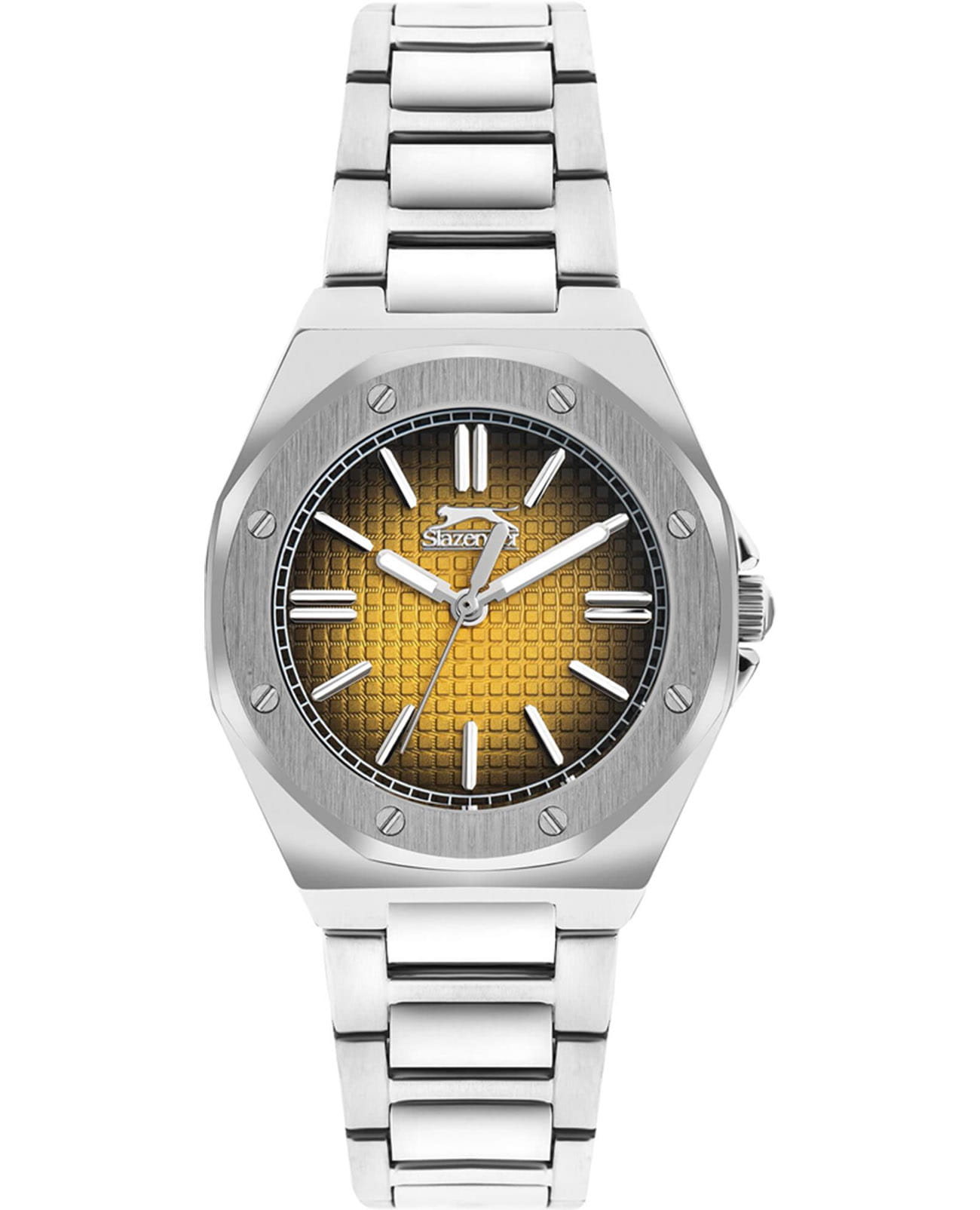 Женские кварцевые часы Slazenger SL.09.2306.3.03 — это элегантный и стильный аксессуар, идеально дополняющий любой образ. Корпус и браслет выполнены из суперметалла, защищён минеральным стекломМинеральное стеклоМинеральное стекло представляет собой искусственно выращенный минерал кварца. Такое стекло отличается особой устойчивостью к повреждениям и царапинам. Уступает по некоторым качествам сапфировому стеклу.. Циферблат жёлтого цвета оформлен в классическом стиле, стрелки оснащены люминесцентным покрытиемЛюминесцентное покрытиеПозволяет считывать показания времени в темноте. Производители наносят на стрелки, часовые индексы, безель или поверхность циферблата светонакопительный состав, дающий холодное свечение., обеспечивающим хорошую читаемость в темноте. Заводная головка снабжена защитой для повышения надёжности. Браслет из суперметалла фиксируется на раскладной застёжкеРаскладная застёжкаТакой тип застёжки используется только на браслетах из металла. Она никогда не раскрывается полностью, происходит разделение на 2 и более частей. Раскладывающая застёжка снизит вероятность потери часов к минимуму., обеспечивая удобство и безопасность ношения. Водонепроницаемость 30 м позволяет использовать часы в повседневных условиях, защищая от случайных брызг и капель дождя. Модель сочетает в себе лёгкость, прочность и изысканный внешний вид.