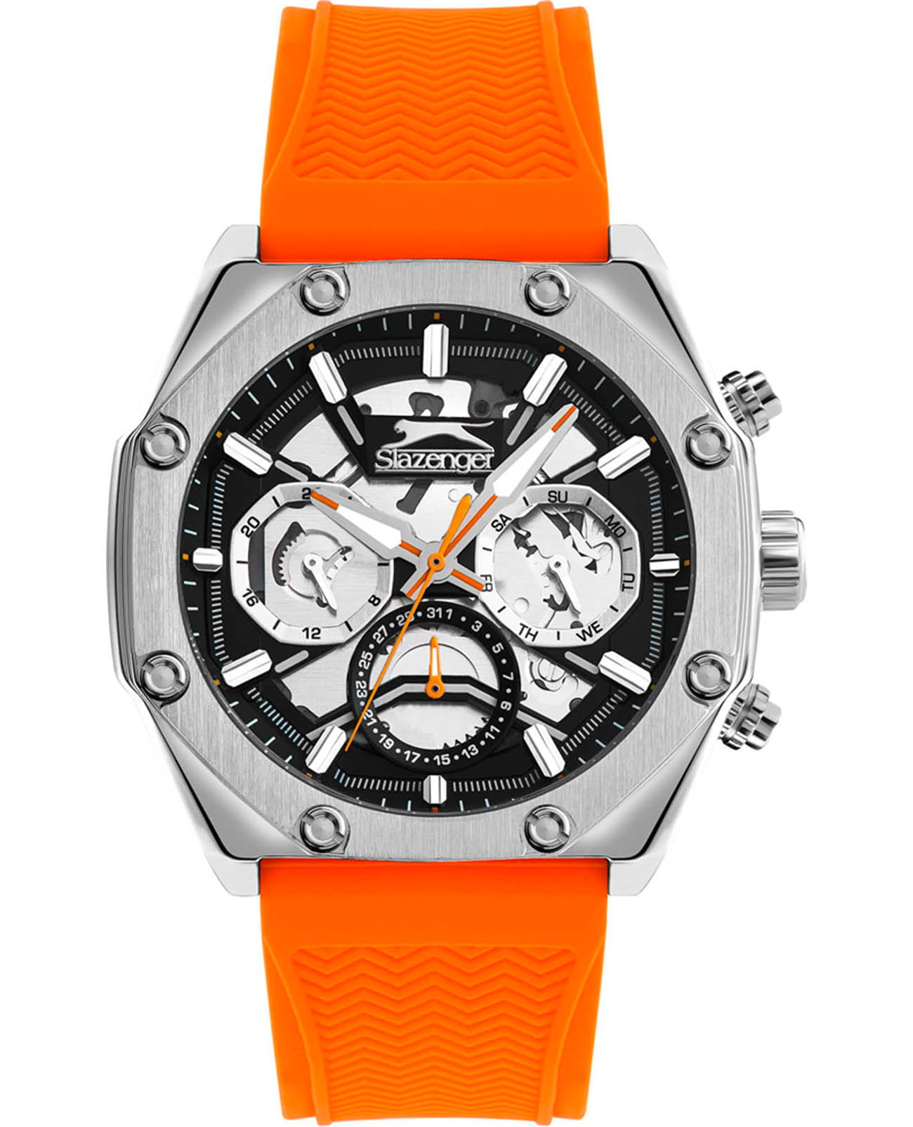 Мужские кварцевые часы Slazenger SL.09.2319.2.07 — это выразительный и функциональный аксессуар, сочетающий стиль, технологичность и насыщенную комплектацию. Корпус выполнен из суперметалла, а циферблат частично скелетонизирован и выполнен в серебристо-чёрных тонах, что позволяет наблюдать за работой механизма. Циферблат защищён минеральным стекломМинеральное стеклоМинеральное стекло представляет собой искусственно выращенный минерал кварца. Такое стекло отличается особой устойчивостью к повреждениям и царапинам. Уступает по некоторым качествам сапфировому стеклу. и дополнен вынесенными малыми циферблатами для индикации дня недели, даты и времени в 24-часовом формате. Стрелки и метки оснащены люминесцентным покрытиемЛюминесцентное покрытиеПозволяет считывать показания времени в темноте. Производители наносят на стрелки, часовые индексы, безель или поверхность циферблата светонакопительный состав, дающий холодное свечение., обеспечивающим хорошую читаемость в темноте. Удобный силиконовый ремешок оранжевого цвета фиксируется на классической пряжке. Водонепроницаемость 50 м позволяет использовать часы в повседневных условиях, защищая от случайных брызг и капель дождя. Модель подчёркивает индивидуальность владельца и идеально подходит как для повседневного, так и для спортивного образа.