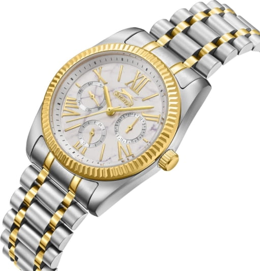 Женские кварцевые часы Slazenger SL.09.2343.4.03 – это сочетание элегантности, современного стиля и надёжности. Изящный корпус из суперметалла серебристого цвета, диаметром 36 мм и толщиной 10.5 мм, подчёркивает утончённость модели и делает их идеальным аксессуаром для любой ситуации – будь то деловая встреча, романтический вечер или повседневные выходы. Циферблат надёжно защищён минеральным стекломМинеральное стеклоМинеральное стекло представляет собой искусственно выращенный минерал кварца. Такое стекло отличается особой устойчивостью к повреждениям и царапинам. Уступает по некоторым качествам сапфировому стеклу., которое устойчиво к механическим повреждениям и сохраняет кристальную прозрачность. Рифленый неподвижный безельБезельВнешний ободок, закрепляющий стекло. В спортивных часах так называется поворотное кольцо с делениями на циферблате, выполняет роль таймера – замеряет отрезки времени на шкале. Неподвижный безель – элемент декора. Однонаправленно вращающийся безель на дайверских часах позволяет фиксировать моменты погружения и выныривания на поверхность. с IP-покрытиемIP-покрытиеМетод ионного напыления. Демонстрирует повышенную устойчивость к истиранию, окислению и химическим веществам. Под воздействием высокого давления и температуры около 1500°C молекулы металла надёжно соединяются с частицами корпуса часов. золотистого цвета. Браслет из суперметалла с частичным IP-покрытиемIP-покрытиеМетод ионного напыления. Демонстрирует повышенную устойчивость к истиранию, окислению и химическим веществам. Под воздействием высокого давления и температуры около 1500°C молекулы металла надёжно соединяются с частицами корпуса часов. удобно облегает запястье и фиксируется с помощью раскладной застёжкиРаскладная застёжкаТакой тип застёжки используется только на браслетах из металла. Она никогда не раскрывается полностью, происходит разделение на 2 и более частей. Раскладывающая застёжка снизит вероятность потери часов к минимуму., обеспечивая надёжность и комфорт в повседневном ношении. Утончённый стиль, внимание к деталям и практичность делают эту модель идеальным выбором для современных женщин, ценящих эстетику и функциональность. Вынесенный циферблат с 24-х часовым указателем времени. Водозащита до 30 метров позволит защитить корпус от случайных брызг или капель дождя.