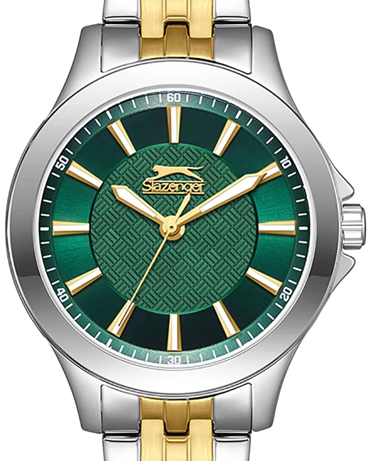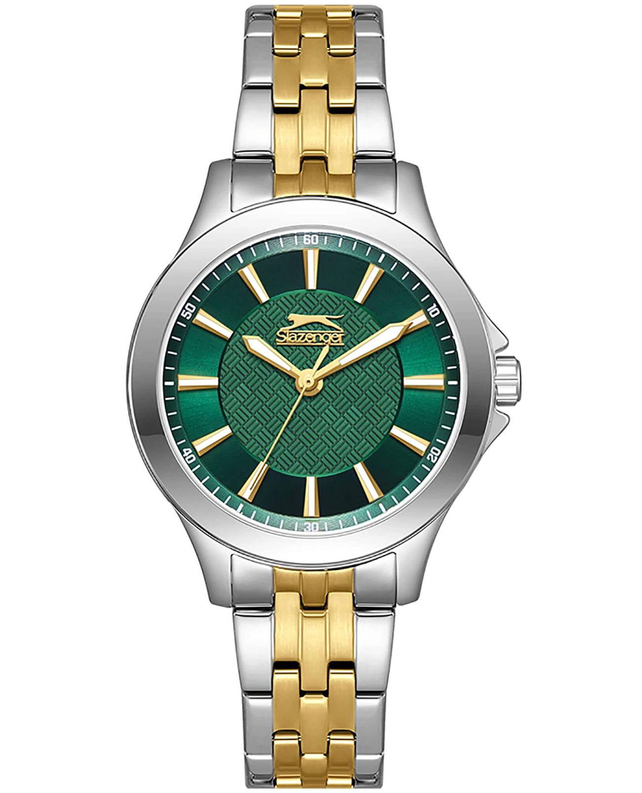 Женские кварцевые часы Slazenger SL.09.2349.3.05 – это сочетание элегантности, современного стиля и надёжности. Изящный корпус из суперметалла серебристого цвета, диаметром 36 мм и толщиной 9 мм, подчёркивает утончённость модели и делает их идеальным аксессуаром для любой ситуации – будь то деловая встреча, романтический вечер или повседневные выходы. Циферблат надёжно защищён минеральным стекломМинеральное стеклоМинеральное стекло представляет собой искусственно выращенный минерал кварца. Такое стекло отличается особой устойчивостью к повреждениям и царапинам. Уступает по некоторым качествам сапфировому стеклу., которое устойчиво к механическим повреждениям и сохраняет кристальную прозрачность. Браслет из суперметалла с IP-покрытиемIP-покрытиеМетод ионного напыления. Демонстрирует повышенную устойчивость к истиранию, окислению и химическим веществам. Под воздействием высокого давления и температуры около 1500°C молекулы металла надёжно соединяются с частицами корпуса часов. золотистого цвета удобно облегает запястье и фиксируется с помощью раскладной застёжкиРаскладная застёжкаТакой тип застёжки используется только на браслетах из металла. Она никогда не раскрывается полностью, происходит разделение на 2 и более частей. Раскладывающая застёжка снизит вероятность потери часов к минимуму., обеспечивая надёжность и комфорт в повседневном ношении. Утончённый стиль, внимание к деталям и практичность делают эту модель идеальным выбором для современных женщин, ценящих эстетику и функциональность. Стрелки и метки покрыты люминесцентным покрытиемЛюминесцентное покрытиеПозволяет считывать показания времени в темноте. Производители наносят на стрелки, часовые индексы, безель или поверхность циферблата светонакопительный состав, дающий холодное свечение., обеспечивающим отличную читаемость в темноте. Водозащита до 30 метров позволит защитить корпус от случайных брызг или капель дождя.