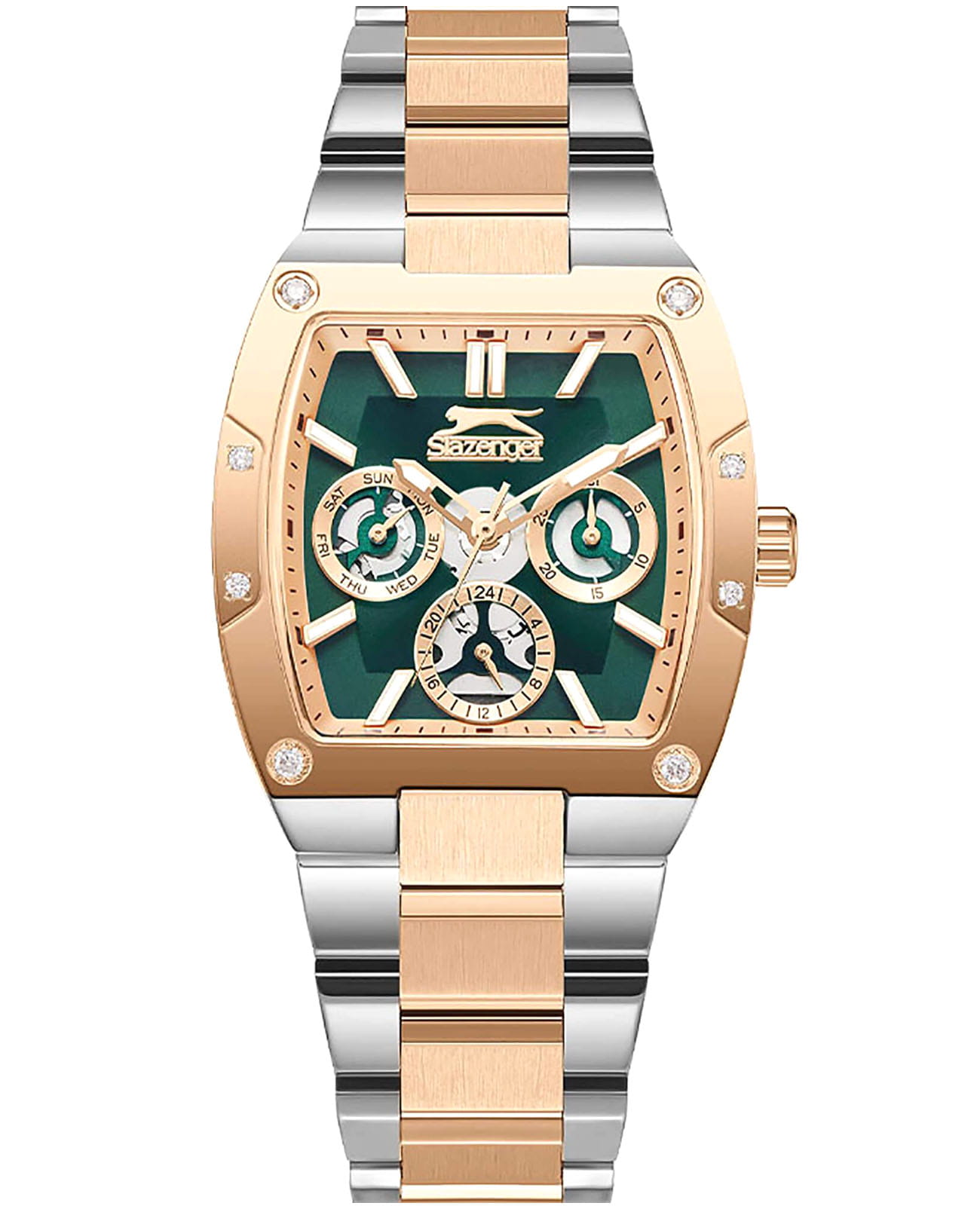Женские кварцевые часы Slazenger SL.09.2357.4.06 – это сочетание элегантности, современного стиля и надёжности. Изящный корпус из суперметалла с IP-покрытиемIP-покрытиеМетод ионного напыления. Демонстрирует повышенную устойчивость к истиранию, окислению и химическим веществам. Под воздействием высокого давления и температуры около 1500°C молекулы металла надёжно соединяются с частицами корпуса часов. золотистого цвета, размером 32 мм х 33 мм и толщиной 10 мм, подчёркивает утончённость модели и делает их идеальным аксессуаром для любой ситуации – будь то деловая встреча, романтический вечер или повседневные выходы. Циферблат надёжно защищён минеральным стекломМинеральное стеклоМинеральное стекло представляет собой искусственно выращенный минерал кварца. Такое стекло отличается особой устойчивостью к повреждениям и царапинам. Уступает по некоторым качествам сапфировому стеклу., которое устойчиво к механическим повреждениям и сохраняет кристальную прозрачность. Браслет из суперметалла с частичным IP-покрытиемIP-покрытиеМетод ионного напыления. Демонстрирует повышенную устойчивость к истиранию, окислению и химическим веществам. Под воздействием высокого давления и температуры около 1500°C молекулы металла надёжно соединяются с частицами корпуса часов. удобно облегает запястье и фиксируется с помощью раскладной застёжкиРаскладная застёжкаТакой тип застёжки используется только на браслетах из металла. Она никогда не раскрывается полностью, происходит разделение на 2 и более частей. Раскладывающая застёжка снизит вероятность потери часов к минимуму., обеспечивая надёжность и комфорт в повседневном ношении. Утончённый стиль, внимание к деталям и практичность делают эту модель идеальным выбором для современных женщин, ценящих эстетику и функциональность. Стрелки и метки покрыты люминесцентным покрытиемЛюминесцентное покрытиеПозволяет считывать показания времени в темноте. Производители наносят на стрелки, часовые индексы, безель или поверхность циферблата светонакопительный состав, дающий холодное свечение., обеспечивающим отличную читаемость в темноте. Вынесенный циферблат с 24-х часовым указателем времени. Водозащита до 30 метров позволит защитить корпус от случайных брызг или капель дождя.