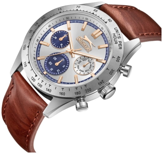 Мужские кварцевые часы Slazenger SL.09.2359.2.04 – идеальное сочетание классического дизайна и современных технологий, созданное для уверенных в себе мужчин. Корпус выполнен из суперметалла серебристого цвета, диаметром 43 мм и толщиной 11 мм, подчёркивает надежность модели и делает их идеальным аксессуаром для любой ситуации – будь то деловая встреча или повседневные выходы. Циферблат надёжно защищён минеральным стекломМинеральное стеклоМинеральное стекло представляет собой искусственно выращенный минерал кварца. Такое стекло отличается особой устойчивостью к повреждениям и царапинам. Уступает по некоторым качествам сапфировому стеклу., которое устойчиво к механическим повреждениям и сохраняет кристальную прозрачность. Кожаный ремешок на стандартной застёжке удобно облегает запястье, обеспечивая надёжность и комфорт в повседневном ношении. Стрелки покрыты люминесцентным покрытиемЛюминесцентное покрытиеПозволяет считывать показания времени в темноте. Производители наносят на стрелки, часовые индексы, безель или поверхность циферблата светонакопительный состав, дающий холодное свечение., обеспечивающим отличную читаемость в темноте. Эти часы станут не просто аксессуаром, а надежным спутником в любой ситуации, подчеркивая ваш безупречный вкус и деловой стиль. Вынесенный циферблат с 24-х часовым указателем времени и функция тахиметраТахиметрРазмеченная шкала, располагается на ободке или безеле часов. Тахиметр позволяет рассчитать скорость на определённом участке пути, расстояние измеряется в километрах или милях.. Водозащита 50 метров позволит защитить корпус от случайных брызг или капель дождя.