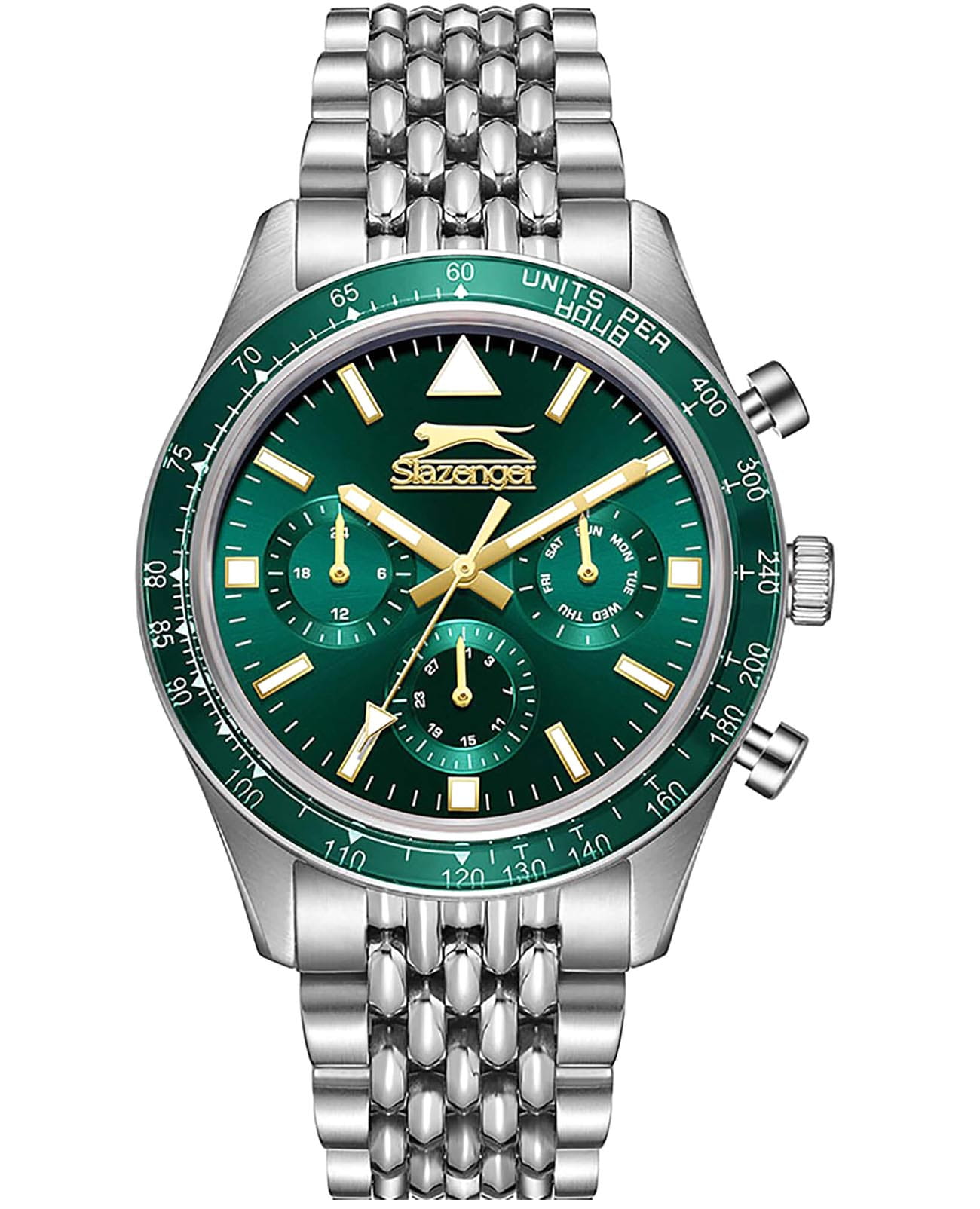 Мужские кварцевые часы Slazenger SL.09.2360.2.04 – идеальное сочетание классического дизайна и современных технологий, созданное для уверенных в себе мужчин. Корпус выполнен из суперметалла серебристого цвета, диаметром 43 мм и толщиной 12 мм, подчёркивает надежность модели и делает их идеальным аксессуаром для любой ситуации – будь то деловая встреча или повседневные выходы. Циферблат надёжно защищён минеральным стекломМинеральное стеклоМинеральное стекло представляет собой искусственно выращенный минерал кварца. Такое стекло отличается особой устойчивостью к повреждениям и царапинам. Уступает по некоторым качествам сапфировому стеклу., которое устойчиво к механическим повреждениям и сохраняет кристальную прозрачность. Неподвижный безельБезельВнешний ободок, закрепляющий стекло. В спортивных часах так называется поворотное кольцо с делениями на циферблате, выполняет роль таймера – замеряет отрезки времени на шкале. Неподвижный безель – элемент декора. Однонаправленно вращающийся безель на дайверских часах позволяет фиксировать моменты погружения и выныривания на поверхность. с IP-покрытиемIP-покрытиеМетод ионного напыления. Демонстрирует повышенную устойчивость к истиранию, окислению и химическим веществам. Под воздействием высокого давления и температуры около 1500°C молекулы металла надёжно соединяются с частицами корпуса часов. зеленого цвета. Стальной браслет на раскладной застёжкеРаскладная застёжкаТакой тип застёжки используется только на браслетах из металла. Она никогда не раскрывается полностью, происходит разделение на 2 и более частей. Раскладывающая застёжка снизит вероятность потери часов к минимуму. удобно облегает запястье, обеспечивая надёжность и комфорт в повседневном ношении. Стрелки и метки покрыты люминесцентным покрытиемЛюминесцентное покрытиеПозволяет считывать показания времени в темноте. Производители наносят на стрелки, часовые индексы, безель или поверхность циферблата светонакопительный состав, дающий холодное свечение., обеспечивающим отличную читаемость в темноте. Эти часы станут не просто аксессуаром, а надежным спутником в любой ситуации, подчеркивая ваш безупречный вкус и деловой стиль. Вынесенный циферблат с 24-х часовым указателем времени и функция тахиметраТахиметрРазмеченная шкала, располагается на ободке или безеле часов. Тахиметр позволяет рассчитать скорость на определённом участке пути, расстояние измеряется в километрах или милях.. Водозащита 50 метров позволит защитить корпус от случайных брызг или капель дождя.