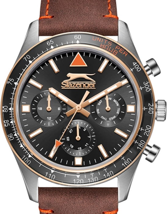Slazenger SL.09.2361.2.02 — стильные мужские часы, сочетающие современный дизайн и функциональность. Корпус выполнен из суперметалла, а безельБезельВнешний ободок, закрепляющий стекло. В спортивных часах так называется поворотное кольцо с делениями на циферблате, выполняет роль таймера – замеряет отрезки времени на шкале. Неподвижный безель – элемент декора. Однонаправленно вращающийся безель на дайверских часах позволяет фиксировать моменты погружения и выныривания на поверхность. покрыт PVDPVDУльтратонкое покрытие наносится в технике вакуумного напыления, сочетает в себе нитрид титана особой прочности со слоем золота или оксида хрома. Несёт в себе декоративную или защитную функцию.-покрытием черного цвета, придающим модели выразительный и элегантный вид. Минеральное стеклоМинеральное стеклоМинеральное стекло представляет собой искусственно выращенный минерал кварца. Такое стекло отличается особой устойчивостью к повреждениям и царапинам. Уступает по некоторым качествам сапфировому стеклу. защищает циферблат от царапин и гарантирует превосходную читаемость. Черный циферблат с контрастными метками и стрелками обеспечивает отличную читаемость в любых условиях. Кожаный ремешок придаёт модели классический стиль и комфорт при ношении. Функциональность дополняется индикацией даты, дня недели и 24-часовым форматом времени. Водонепроницаемость 50 метров делает модель устойчивой к случайным брызгам, идеально подходя для повседневного использования.