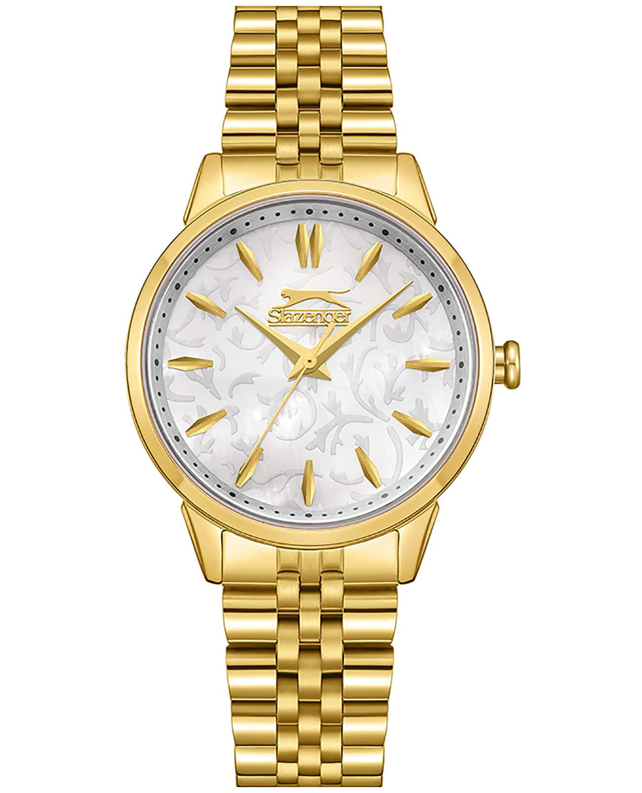 Женские кварцевые часы Slazenger SL.09.2373.3.05 – это сочетание элегантности, современного стиля и надёжности. Изящный корпус из суперметалла с IP-покрытиемIP-покрытиеМетод ионного напыления. Демонстрирует повышенную устойчивость к истиранию, окислению и химическим веществам. Под воздействием высокого давления и температуры около 1500°C молекулы металла надёжно соединяются с частицами корпуса часов. золотистого цвета, диаметром 34 мм и толщиной 9 мм, подчёркивает утончённость модели и делает их идеальным аксессуаром для любой ситуации – будь то деловая встреча, романтический вечер или повседневные выходы. Циферблат надёжно защищён минеральным стекломМинеральное стеклоМинеральное стекло представляет собой искусственно выращенный минерал кварца. Такое стекло отличается особой устойчивостью к повреждениям и царапинам. Уступает по некоторым качествам сапфировому стеклу., которое устойчиво к механическим повреждениям и сохраняет кристальную прозрачность. Браслет из суперметалла с IP-покрытиемIP-покрытиеМетод ионного напыления. Демонстрирует повышенную устойчивость к истиранию, окислению и химическим веществам. Под воздействием высокого давления и температуры около 1500°C молекулы металла надёжно соединяются с частицами корпуса часов. удобно облегает запястье и фиксируется с помощью раскладной застёжкиРаскладная застёжкаТакой тип застёжки используется только на браслетах из металла. Она никогда не раскрывается полностью, происходит разделение на 2 и более частей. Раскладывающая застёжка снизит вероятность потери часов к минимуму., обеспечивая надёжность и комфорт в повседневном ношении. Утончённый стиль, внимание к деталям и практичность делают эту модель идеальным выбором для современных женщин, ценящих эстетику и функциональность. Водозащита до 30 метров позволит защитить корпус от случайных брызг или капель дождя.
