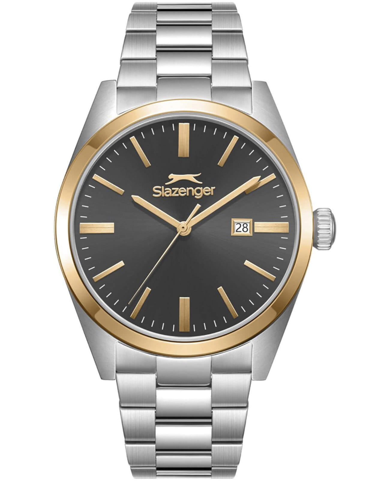 Мужские кварцевые часы Slazenger — это выразительный и функциональный аксессуар. Корпус диаметром 42 мм и толщиной 12 мм выполнен из нержавеющей стали 316L. БезельБезельВнешний ободок, закрепляющий стекло. В спортивных часах так называется поворотное кольцо с делениями на циферблате, выполняет роль таймера – замеряет отрезки времени на шкале. Неподвижный безель – элемент декора. Однонаправленно вращающийся безель на дайверских часах позволяет фиксировать моменты погружения и выныривания на поверхность. с IP-покрытиемIP-покрытиеМетод ионного напыления. Демонстрирует повышенную устойчивость к истиранию, окислению и химическим веществам. Под воздействием высокого давления и температуры около 1500°C молекулы металла надёжно соединяются с частицами корпуса часов.. Циферблат чёрного цвета оформлен индексами и стрелками. Циферблат защищён минеральным стекломМинеральное стеклоМинеральное стекло представляет собой искусственно выращенный минерал кварца. Такое стекло отличается особой устойчивостью к повреждениям и царапинам. Уступает по некоторым качествам сапфировому стеклу.. Механизм — кварцевый. Окошко даты расположено в положении 3 часов. Часы оснащены стальным браслетом с раскладной застёжкойРаскладная застёжкаТакой тип застёжки используется только на браслетах из металла. Она никогда не раскрывается полностью, происходит разделение на 2 и более частей. Раскладывающая застёжка снизит вероятность потери часов к минимуму.. Водонепроницаемость 100 м позволяет использовать часы для плавания и повседневного ношения. Гарантия — 12 месяцев. Идеальный выбор для тех, кто ценит стиль, функциональность и качество.