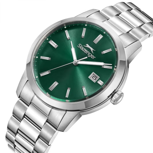 Мужские кварцевые часы Slazenger — это выразительный и функциональный аксессуар. Корпус диаметром 42 мм и толщиной 12 мм выполнен из нержавеющей стали 316L. Циферблат зелёного цвета оформлен индексами и стрелками. Циферблат защищён минеральным стекломМинеральное стеклоМинеральное стекло представляет собой искусственно выращенный минерал кварца. Такое стекло отличается особой устойчивостью к повреждениям и царапинам. Уступает по некоторым качествам сапфировому стеклу.. Механизм — кварцевый. Окошко даты расположено в положении 3 часов. Стрелки и метки с люминесцентным покрытиемЛюминесцентное покрытиеПозволяет считывать показания времени в темноте. Производители наносят на стрелки, часовые индексы, безель или поверхность циферблата светонакопительный состав, дающий холодное свечение., обеспечивающим хорошую читаемость в темноте. Часы оснащены стальным браслетом на застёжке «бабочка» с кнопкамиЗастёжка "бабочка"Такой вид застёжки дополняется предохранителями, помогающими избежать случайного раскрытия браслета. Обладают изящным исполнением. . Водонепроницаемость 100 м позволяет использовать часы для плавания и повседневного ношения. Гарантия — 12 месяцев. Идеальный выбор для тех, кто ценит стиль, функциональность и качество.