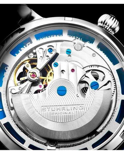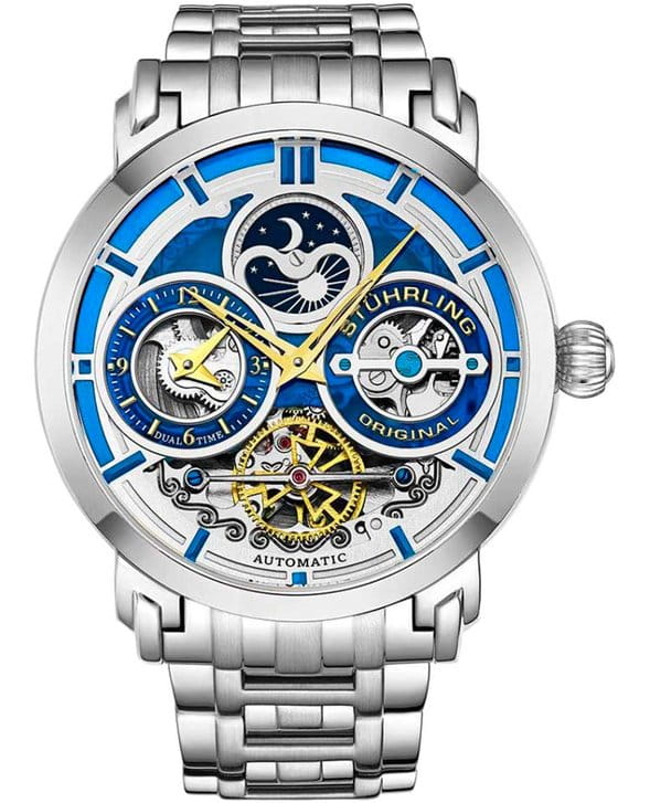 Мужские наручные часы Stührling Original 371B.02 из коллекции Luciano Automatic Skeleton сочетают в себе классический дизайн и современные технологии . Модель оснащена механическим механизмом с автоподзаводом, что гарантирует точность хода без необходимости ручного завода . Корпус часов диаметром 47 мм изготовлен из нержавеющей стали с комбинацией полированной и матовой отделки, что подчеркивает элегантность модели . Защиту циферблата обеспечивает прочное стекло KrysternaKrysternaKrysterna — инновационное стекло для наручных часов. Благодаря уникальной структуре, Krysterna объединяет ключевые преимущества двух материалов: твердость сапфира, защищающую от царапин, и гибкость минерального стекла, обеспечивающую устойчивость к деформациям. Такая комбинация делает его идеальным решением для часов, подверженных экстремальным нагрузкам, сохраняя при этом оптическую прозрачность., известное своей устойчивостью к царапинам и механическим повреждениям . Циферблат выполнен в стиле , что позволяет наблюдать за работой внутреннего механизма и демонстрирует сложность инженерного решения . Такой дизайн делает модель не только функциональной, но и стильной, привлекая внимание ценителей сложных технических решений. Браслет из того же материала на раскладной застёжкеРаскладная застёжкаТакой тип застёжки используется только на браслетах из металла. Она никогда не раскрывается полностью, происходит разделение на 2 и более частей. Раскладывающая застёжка снизит вероятность потери часов к минимуму.. Водонепроницаемость модели достигает 5 атмосфер (50 метров), что позволяет использовать их в повседневных условиях, включая контакт с водой, например, при мытье рук или дожде . Заводная головка с системой завинчивания обеспечивает дополнительную защиту механизма от внешних воздействий.