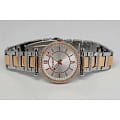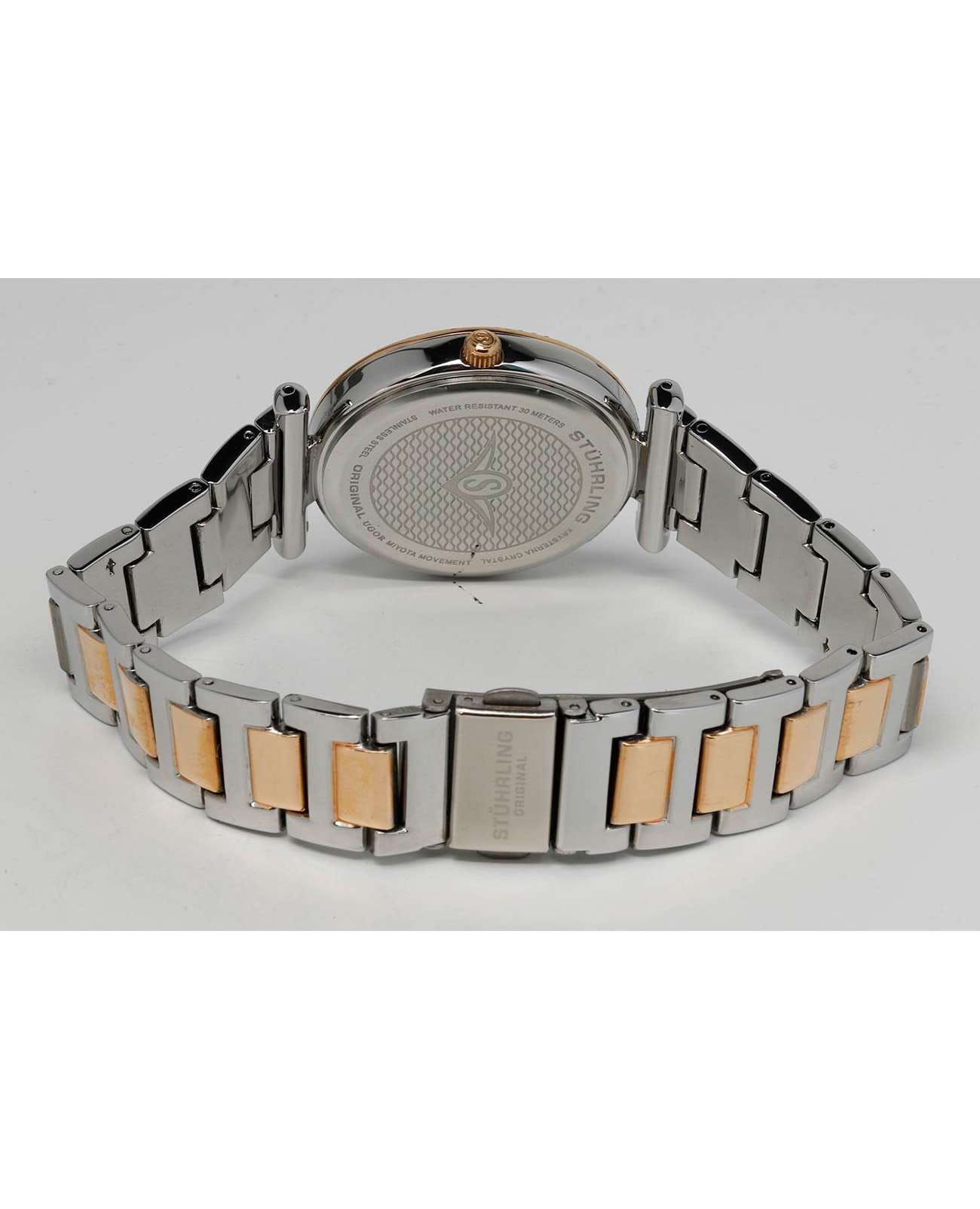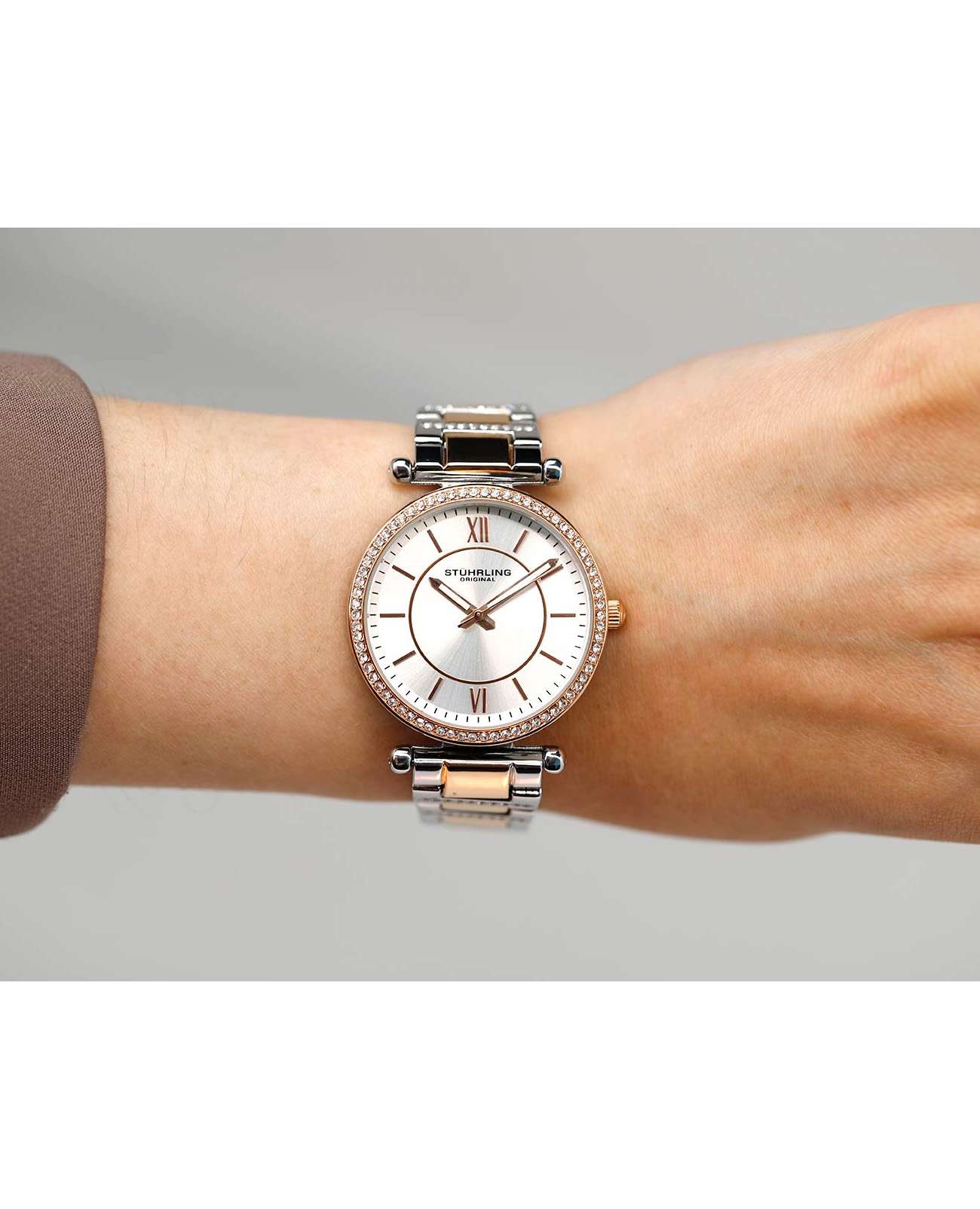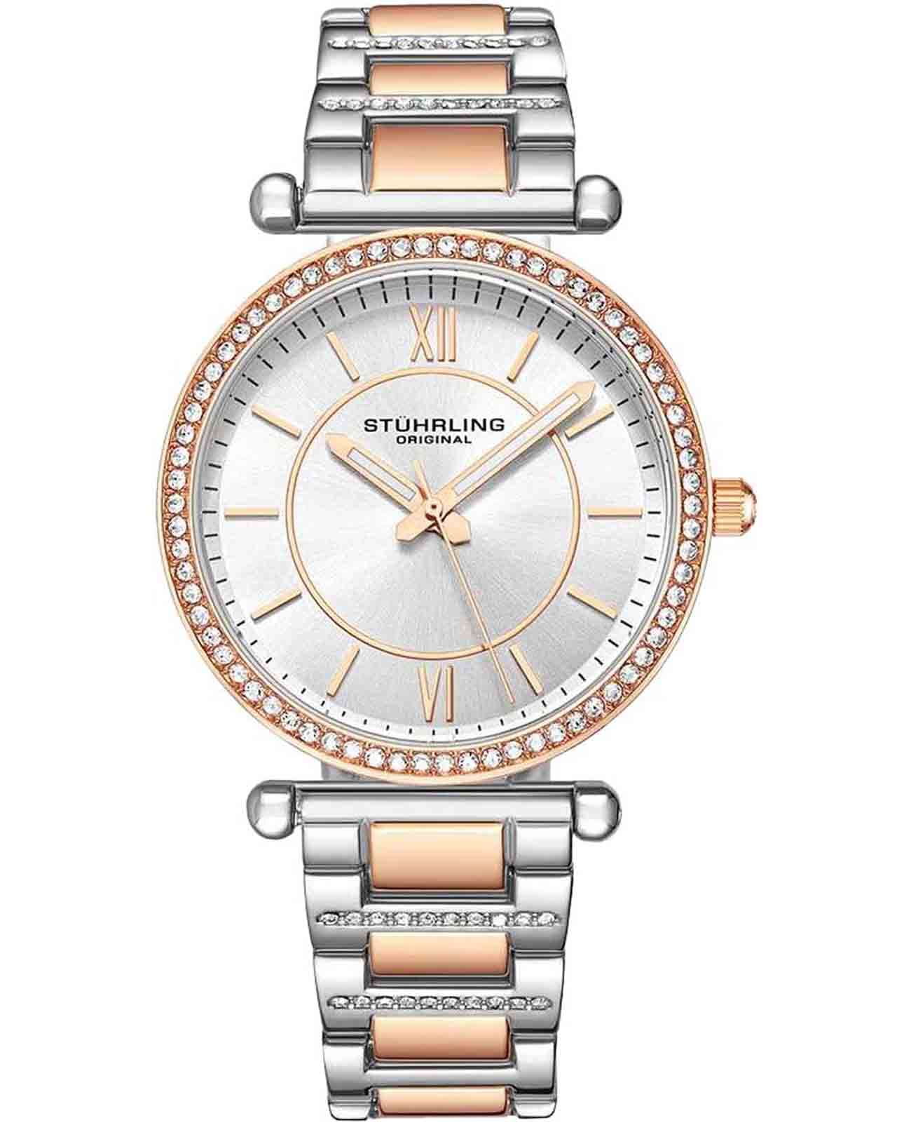 Женские наручные часы Stuhrling 3905.3 из коллекции Aria сочетают в себе элегантный дизайн и функциональность. Модель обладает круглым корпусом диаметром 36,0 мм, изготовленным из нержавеющей стали, что обеспечивает прочность и устойчивость к внешним воздействиям. БезельБезельВнешний ободок, закрепляющий стекло. В спортивных часах так называется поворотное кольцо с делениями на циферблате, выполняет роль таймера – замеряет отрезки времени на шкале. Неподвижный безель – элемент декора. Однонаправленно вращающийся безель на дайверских часах позволяет фиксировать моменты погружения и выныривания на поверхность. с PVD-покрытиемPVDУльтратонкое покрытие наносится в технике вакуумного напыления, сочетает в себе нитрид титана особой прочности со слоем золота или оксида хрома. Несёт в себе декоративную или защитную функцию.. Браслет выполнен из стали с частичным розовым PVD-покрытиемPVDУльтратонкое покрытие наносится в технике вакуумного напыления, сочетает в себе нитрид титана особой прочности со слоем золота или оксида хрома. Несёт в себе декоративную или защитную функцию. и оснащен раскладной застежкойРаскладной замокДанный вариант застежки используется только на часах с металлическим браслетом. Отличительная особенность такого крепления в том, что длина браслета становится универсальной и вы можете самостоятельно отрегулировать нужный вам размер – застежка просто двигается по браслету часов., гарантирующей комфортное ношение . Серебристый циферблат выполнен по технологии Sunray (солнечные лучи), что придает ему особый блеск и стиль . Циферблат украшен накладными метками в виде штрихов и двух камней, подчеркивающих изысканность модели . Для защиты используется KrysternaKrysternaKrysterna — инновационное стекло для наручных часов. Благодаря уникальной структуре, Krysterna объединяет ключевые преимущества двух материалов: твердость сапфира, защищающую от царапин, и гибкость минерального стекла, обеспечивающую устойчивость к деформациям. Такая комбинация делает его идеальным решением для часов, подверженных экстремальным нагрузкам, сохраняя при этом оптическую прозрачность., обеспечивающее надежную защиту от царапин . Часы работают на кварцевом механизме, что гарантирует точное время без необходимости подзаводки. Водонепроницаемость часов составляет 30WR, что позволяет использовать их в повседневной жизни, включая контакт с водой, например, при мытье рук, но не рекомендуется для плавания или дайвинга.