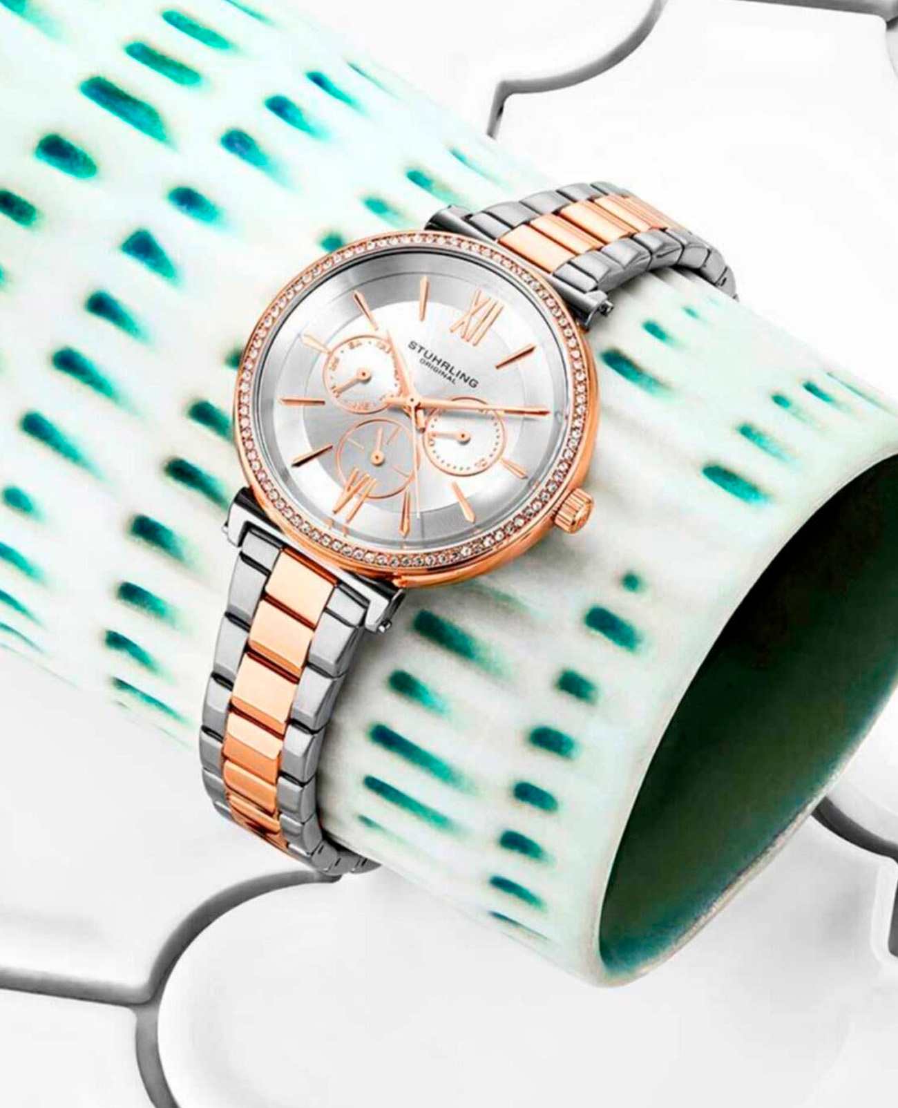 Женские наручные часы Stuhrling 3908.3 сочетают в себе элегантный дизайн и функциональность. Модель обладает круглым корпусом диаметром 40,0 мм, изготовленным из стали с розовым PVD-покрытиемPVDУльтратонкое покрытие наносится в технике вакуумного напыления, сочетает в себе нитрид титана особой прочности со слоем золота или оксида хрома. Несёт в себе декоративную или защитную функцию., что обеспечивает прочность и устойчивость к внешним воздействиям . Толщина корпуса составляет 8,5 мм, что делает часы достаточно компактными для повседневного использования . Браслет из того же материала с частичным PVD-покрытиемPVDУльтратонкое покрытие наносится в технике вакуумного напыления, сочетает в себе нитрид титана особой прочности со слоем золота или оксида хрома. Несёт в себе декоративную или защитную функцию. на раскладной застёжкеРаскладная застёжкаТакой тип застёжки используется только на браслетах из металла. Она никогда не раскрывается полностью, происходит разделение на 2 и более частей. Раскладывающая застёжка снизит вероятность потери часов к минимуму.. Серебристый циферблат украшен римскими цифрами и накладными метками, подчеркивающими классический стиль модели . Для защиты используется стекло KrysternaKrysternaKrysterna — инновационное стекло для наручных часов. Благодаря уникальной структуре, Krysterna объединяет ключевые преимущества двух материалов: твердость сапфира, защищающую от царапин, и гибкость минерального стекла, обеспечивающую устойчивость к деформациям. Такая комбинация делает его идеальным решением для часов, подверженных экстремальным нагрузкам, сохраняя при этом оптическую прозрачность., обеспечивающее повышенную устойчивость к царапинам и надежную защиту циферблата. Часы работают на кварцевом механизме, что гарантирует точное время без необходимости подзаводки . Водонепроницаемость часов составляет 30WR, что позволяет использовать их в повседневной жизни, включая контакт с водой, например, при мытье рук, но не рекомендуется для плавания или дайвинга.
