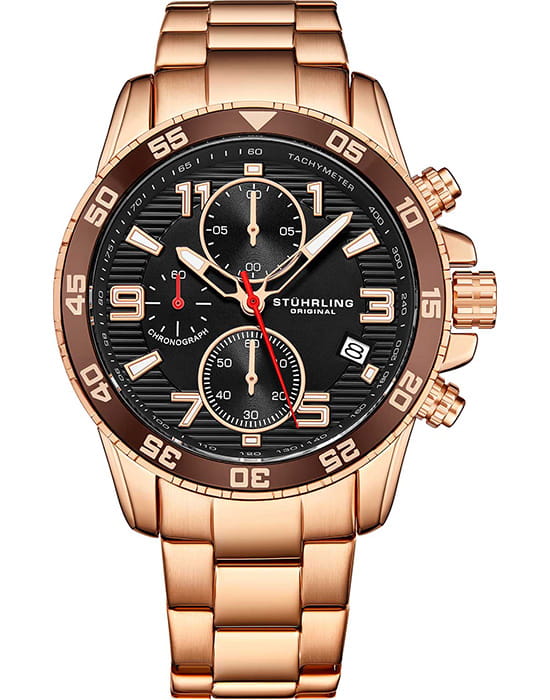 Stuhrling 3957.4 — мощные мужские часы с выразительным спортивным характером и динамичным дизайном. Корпус из нержавеющей стали с PVD-покрытиемPVDУльтратонкое покрытие наносится в технике вакуумного напыления, сочетает в себе нитрид титана особой прочности со слоем золота или оксида хрома. Несёт в себе декоративную или защитную функцию. гармонично сочетается с циферблатом, оформленным рельефным узором и контрастными счётчиками хронографаХронографФункция позволяет измерять отрезки времени с особой точностью: часы, минуты, секунды. Верным признаком хронографа является наличие на циферблате 3 дополнительных окошек-счётчиков.. Широкий безельБезельВнешний ободок, закрепляющий стекло. В спортивных часах так называется поворотное кольцо с делениями на циферблате, выполняет роль таймера – замеряет отрезки времени на шкале. Неподвижный безель – элемент декора. Однонаправленно вращающийся безель на дайверских часах позволяет фиксировать моменты погружения и выныривания на поверхность. с PVD-покрытиемPVDУльтратонкое покрытие наносится в технике вакуумного напыления, сочетает в себе нитрид титана особой прочности со слоем золота или оксида хрома. Несёт в себе декоративную или защитную функцию. подчёркивает брутальный стиль модели, а стрелки и метки с люминесцентным покрытиемЛюминесцентное покрытиеПозволяет считывать показания времени в темноте. Производители наносят на стрелки, часовые индексы, безель или поверхность циферблата светонакопительный состав, дающий холодное свечение. обеспечивают идеальную читаемость в любых условиях. Прочное стекло KrysternaKrysternaKrysterna — инновационное стекло для наручных часов. Благодаря уникальной структуре, Krysterna объединяет ключевые преимущества двух материалов: твердость сапфира, защищающую от царапин, и гибкость минерального стекла, обеспечивающую устойчивость к деформациям. Такая комбинация делает его идеальным решением для часов, подверженных экстремальным нагрузкам, сохраняя при этом оптическую прозрачность. устойчиво к царапинам, сохраняя прозрачность и блеск. Завершает образ стальной браслет с PVD-покрытиемPVDУльтратонкое покрытие наносится в технике вакуумного напыления, сочетает в себе нитрид титана особой прочности со слоем золота или оксида хрома. Несёт в себе декоративную или защитную функцию. и раскладной застёжкойРаскладная застёжкаТакой тип застёжки используется только на браслетах из металла. Она никогда не раскрывается полностью, происходит разделение на 2 и более частей. Раскладывающая застёжка снизит вероятность потери часов к минимуму., гарантирующий комфорт и надёжную фиксацию. Stuhrling — стильная и функциональная модель для уверенных мужчин, ценящих точность и энергию в каждой детали.