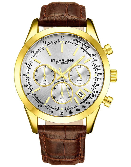 Stuhrling 3975L.8 — стильные мужские часы с выразительным пилотским дизайном и мощным функционалом. Классический циферблат дополнен контрастными счётчиками хронографаХронографФункция позволяет измерять отрезки времени с особой точностью: часы, минуты, секунды. Верным признаком хронографа является наличие на циферблате 3 дополнительных окошек-счётчиков., тахиметрической шкалой по ободу и аккуратным окошком даты, подчёркивающими технический характер модели. Корпус из нержавеющей стали с PVD-покрытиемPVDУльтратонкое покрытие наносится в технике вакуумного напыления, сочетает в себе нитрид титана особой прочности со слоем золота или оксида хрома. Несёт в себе декоративную или защитную функцию. придаёт часам надёжность и современный блеск, а стекло KrysternaKrysternaKrysterna — инновационное стекло для наручных часов. Благодаря уникальной структуре, Krysterna объединяет ключевые преимущества двух материалов: твердость сапфира, защищающую от царапин, и гибкость минерального стекла, обеспечивающую устойчивость к деформациям. Такая комбинация делает его идеальным решением для часов, подверженных экстремальным нагрузкам, сохраняя при этом оптическую прозрачность. защищает поверхность от царапин и сохраняет кристальную прозрачность. Кожаный ремень с классической текстурой аллигатора и стандартной застежкой, обеспечивает комфорт и элегантную посадку на запястье. Stuhrling — гармония силы, точности и изысканного стиля для мужчин, ценящих уверенность и безупречный вкус.