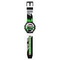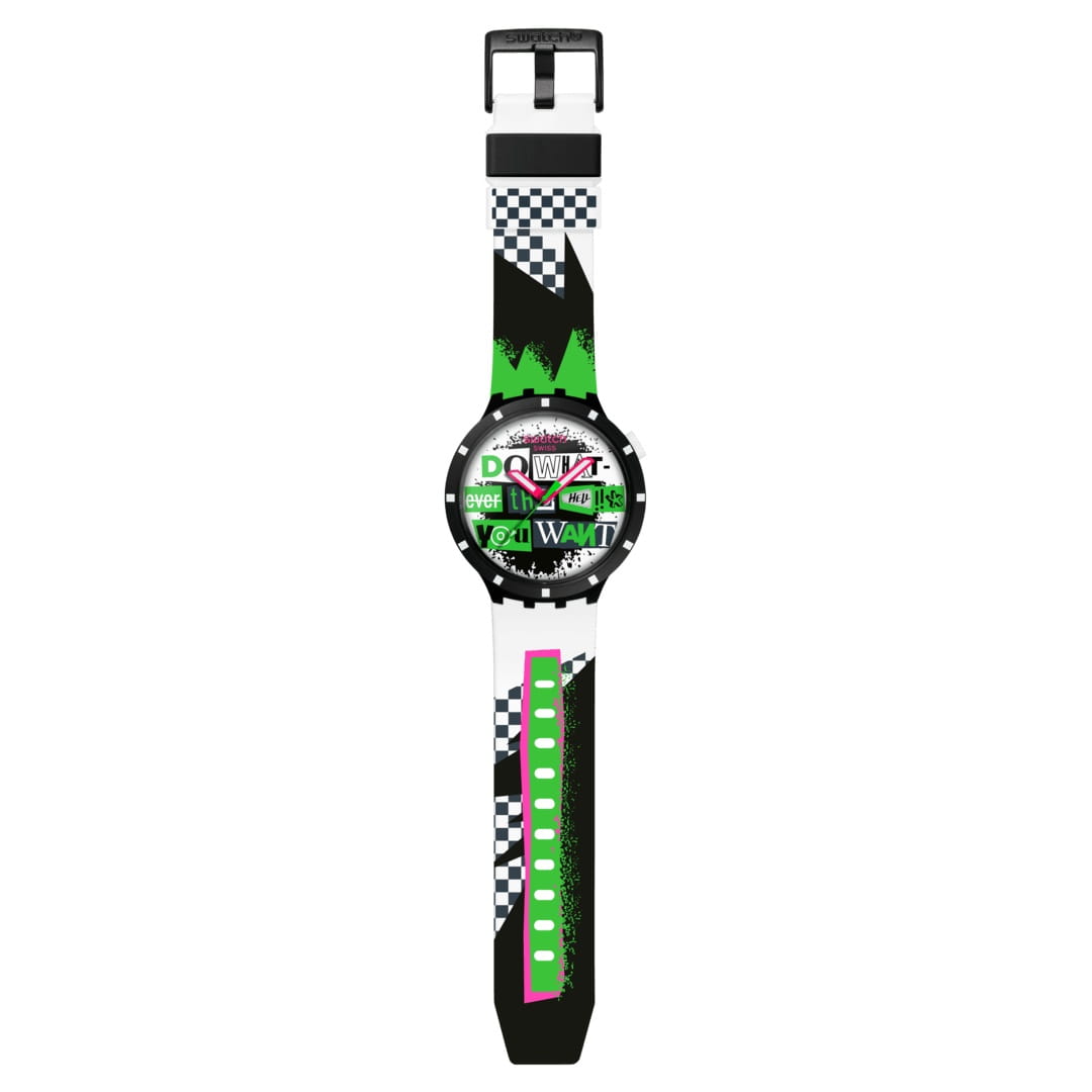 Мужские наручные часы Swatch LASH OUT SB03B701 — это стильный и современный аксессуар для тех, кто ценит лёгкость и комфорт. На крупном белом циферблате этих часов размещен броский цветной принт с надписью: «Do whatever the … you want» («Делай что... хочешь»), в которую специальное окошко календаря подставляет на место пропуска слово, меняющееся раз в две недели. Корпус и безельБезельВнешний ободок, закрепляющий стекло. В спортивных часах так называется поворотное кольцо с делениями на циферблате, выполняет роль таймера – замеряет отрезки времени на шкале. Неподвижный безель – элемент декора. Однонаправленно вращающийся безель на дайверских часах позволяет фиксировать моменты погружения и выныривания на поверхность. выполнены из биокерамики,  диаметром 47 мм и толщиной 11.75 мм, что обеспечивает долговечность и утончённый внешний вид. Циферблат защищён органическим стеклом, устойчивым к повреждениям. Модель оснащена кварцевым механизмом, обеспечивающим высокую точность хода. Стрелки с люминесцентным покрытиемЛюминесцентное покрытиеПозволяет считывать показания времени в темноте. Производители наносят на стрелки, часовые индексы, безель или поверхность циферблата светонакопительный состав, дающий холодное свечение.. Силиконовый ремешок на стандартной застёжке гармонично дополняет корпус и обеспечивает комфортное ношение. Водозащита 30 метров позволит защитить корпус от случайных брызг или капель дождя. Эти часы подойдут для повседневного ношения и станут ярким акцентом в вашем наряде.