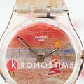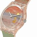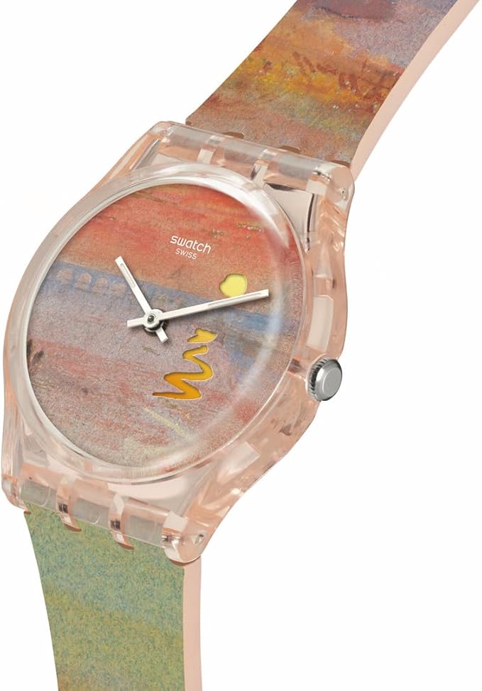 Часы Swatch SO28Z700 — эффектный и надежный аксессуар. Эти часы из коллекции Swatch x Tate Gallery обладают прозрачным глянцево-розовым корпусом и стеклом из биоматериала. Циферблат и матово-розовый ремешок украшены принтом с репродукцией картины Тёрнера (JMW Turner) «Алый закат» («The Scarlet Sunset»). Время отсчитывают серебристые стрелки с люминесцентным покрытиемЛюминесцентное покрытиеПозволяет считывать показания времени в темноте. Производители наносят на стрелки, часовые индексы, безель или поверхность циферблата светонакопительный состав, дающий холодное свечение., которые светятся в темноте, а солнце на циферблате меняет цвет в течение дня благодаря разноцветному календарному колесу. На прозрачном матовом ремешке расположен логотип Tate Gallery. Ремешок из силикона на стандартной застёжке. Внутри часов установлен надежный кварцевый механизм, который обеспечивает точность хода. Эти часы водонепроницаемы до 30 метров, что позволяет не беспокоиться о случайных брызгах или дождевых каплях. Swatch SO28Z700 — это идеальный выбор для тех, кто ценит сочетание стиля, комфорта и функциональности в одном аксессуаре.