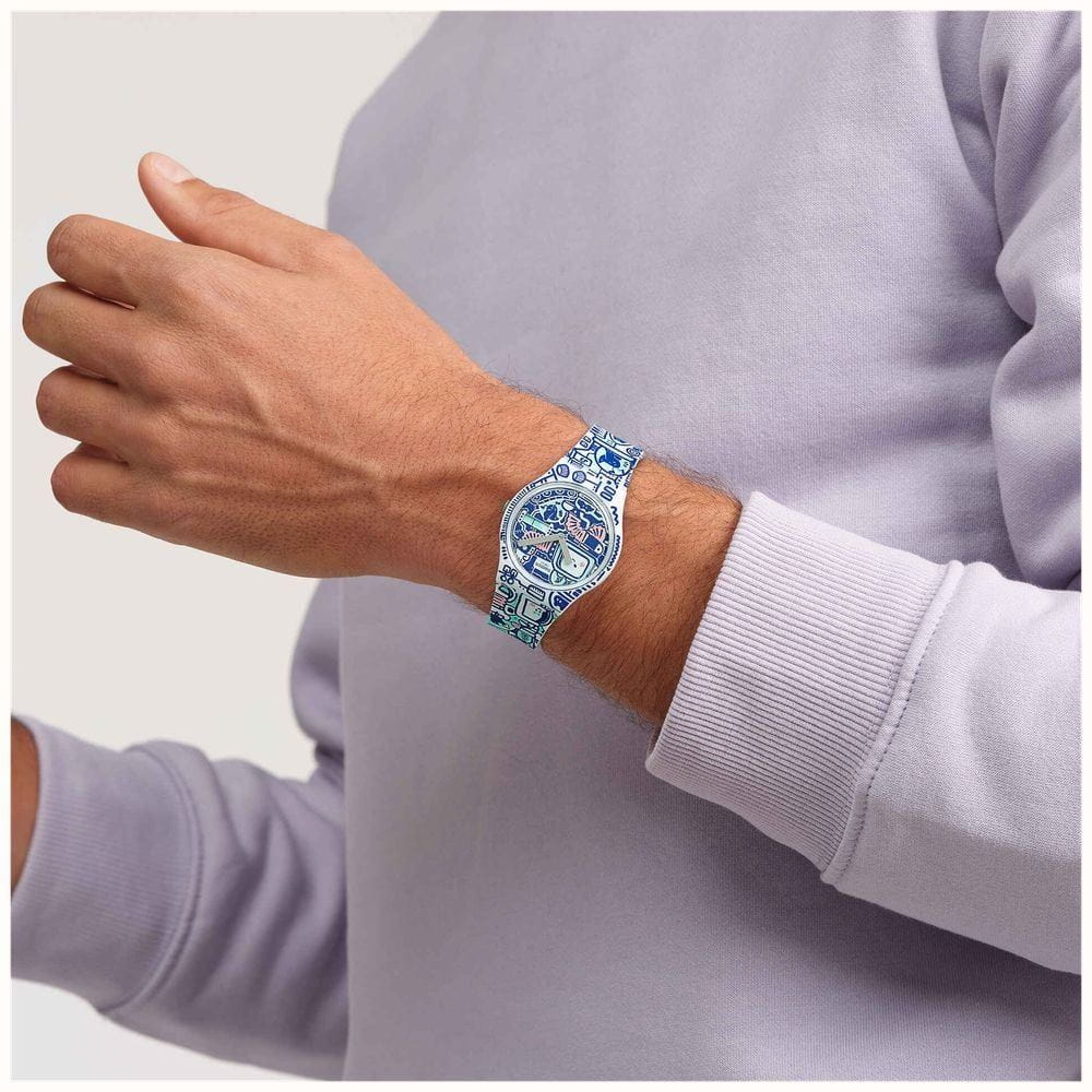 Часы Swatch SO28Z702 — эффектный и надежный аксессуар. Эти веселые часы были созданы в сотрудничестве с уличным художником Бао Хо. Белый циферблат украшен многокрасочным принтом и серебристыми стрелками часов, минут и секунд, все под стеклом из биоматериала. Специальное окно даты и дня месяца также служит индикатором "жизненной силы", который заряжается в течение 7 дней. Матовый белый корпус с темно-синим принтом изготовлен из биоматериала. Матовый белый ремешок с многокрасочным принтом сочетается с матовой темно-синей петлей и пряжкой, также темно-синего цвета. Ремешок из силикона на стандартной застёжке. Внутри часов установлен надежный кварцевый механизм, который обеспечивает точность хода. Эти часы водонепроницаемы до 30 метров, что позволяет не беспокоиться о случайных брызгах или дождевых каплях. Swatch SO28Z702 — это идеальный выбор для тех, кто ценит сочетание стиля, комфорта и функциональности в одном аксессуаре.
