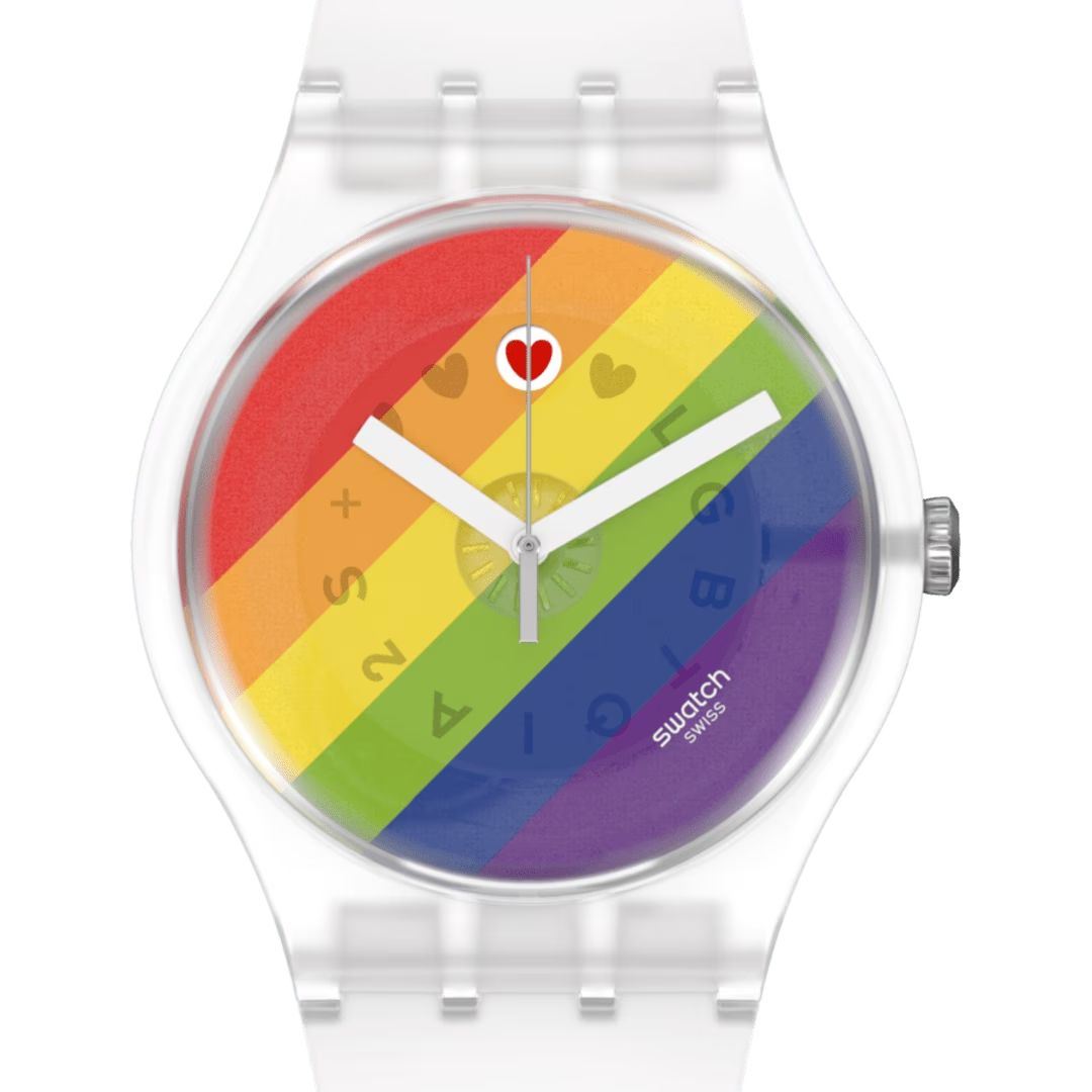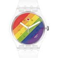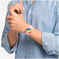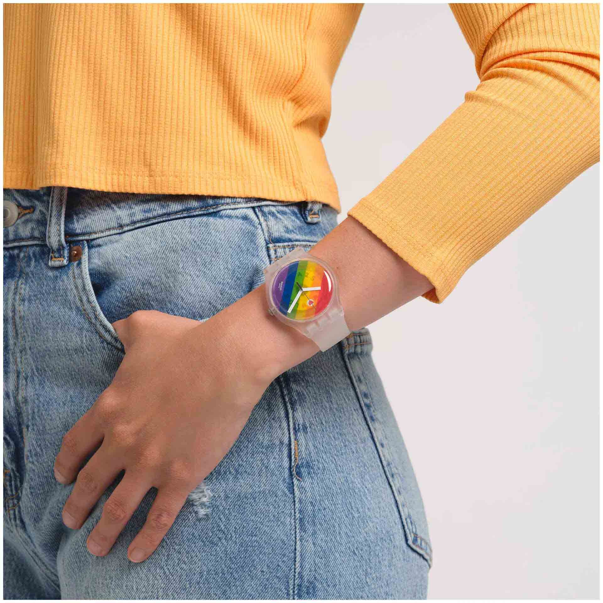 Часы Swatch SO29K701 —  стильный и надежный аксессуар. Эти часы New Gent Biosourced с флагом радужного цвета имеют полупрозрачный циферблат с многоцветным принтом и стекло из биоматериала. Календарное колесо поворачивается каждые 24 часа, так что каждый день появляется новый значок из LGBTQIA2S. Прозрачный матовый корпус из биоматериала на полупрозрачном матовом силиконовом ремешке завершает этот PRIDE WATCH. Поставляются в стандартной упаковке с радужным ремешком. Ремешок из силикона на стандартной застёжке. Внутри часов установлен надежный кварцевый механизм, который обеспечивает точность хода. Эти часы водонепроницаемы до 30 метров, что позволяет не беспокоиться о случайных брызгах или дождевых каплях. Swatch SO29K701 — это идеальный выбор для тех, кто ценит сочетание стиля, комфорта и функциональности в одном аксессуаре.